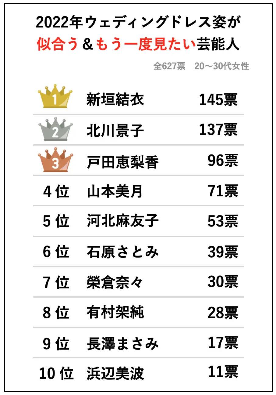 2022年ウェディングドレス姿が似合う&もう一度見たい芸能人ランキングを公開。1位は昨年結婚を発表した新垣結衣さん、2位は北川景子さん、3位は戸田恵梨香さん。