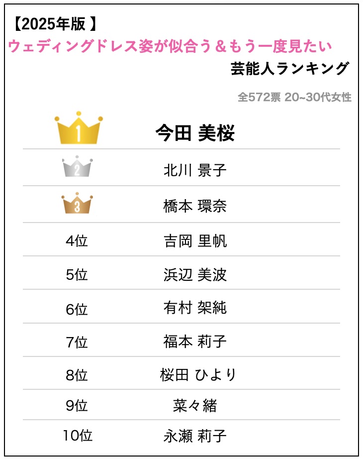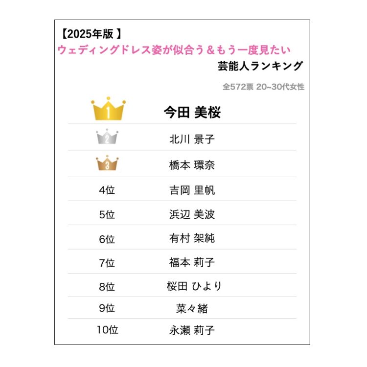 20~30代花嫁インスタユーザー572名が回答した「ウェディングドレス姿が似合う&もう一度見たい芸能人」について。