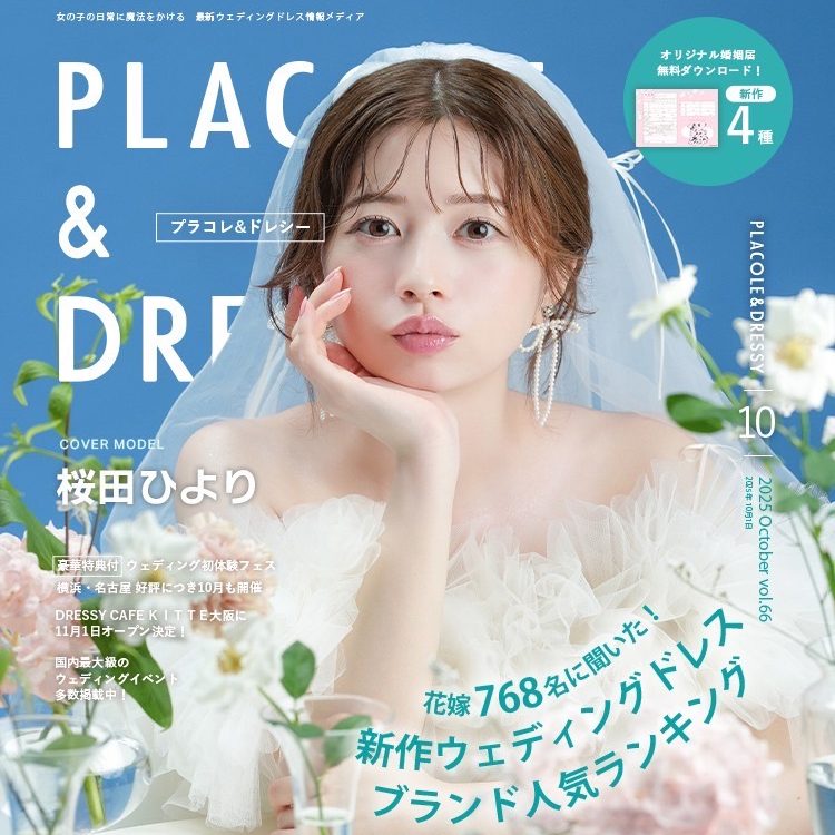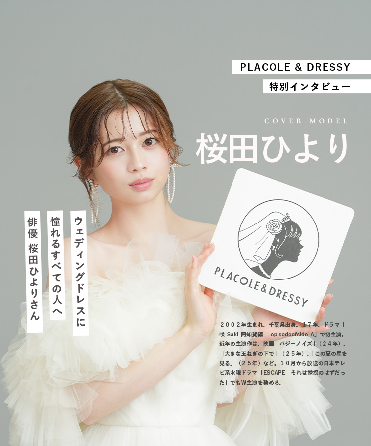 10月号は俳優として活躍する桜田ひよりさんが BRIDARIUM MUE / Irida maison 2着のウェディングドレスを着て登場。着用したコーディネートのポイントやウェディングドレスの魅力、桜田ひよりさんについて DRESSY編集長 武藤みなみよりインタビューさせていただきました。
