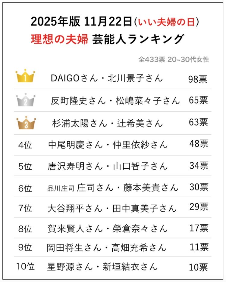 2位は『反町隆史さん&松嶋菜々子さん』ご夫婦、3位は『杉浦太陽さん&辻希美さん』ご夫婦という結果になりました。