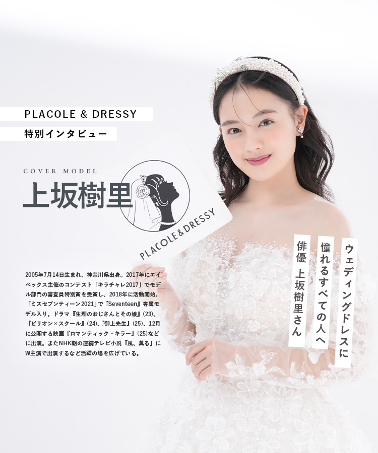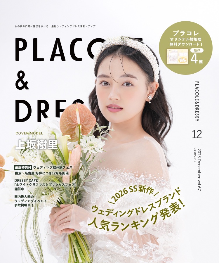 12月号は俳優として活躍する上坂樹里さんが ANTEPRIMA with PLACOLE&DRESSY Limited modelのカラードレスと、ATELIER Puretéのウェディングドレスを着て登場。着用したコーディネートのポイントやウェディングドレスの魅力、上坂樹里さんについて DRESSY編集長 武藤みなみよりインタビューさせていただきました。