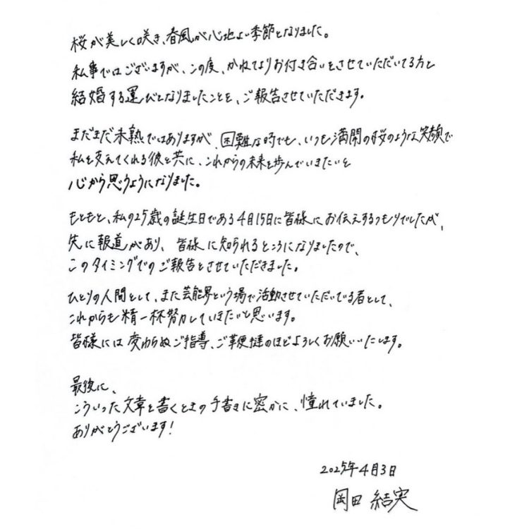 関係者によると、お相手は一般女性とのことで5月に婚姻届を提出したとのことです。