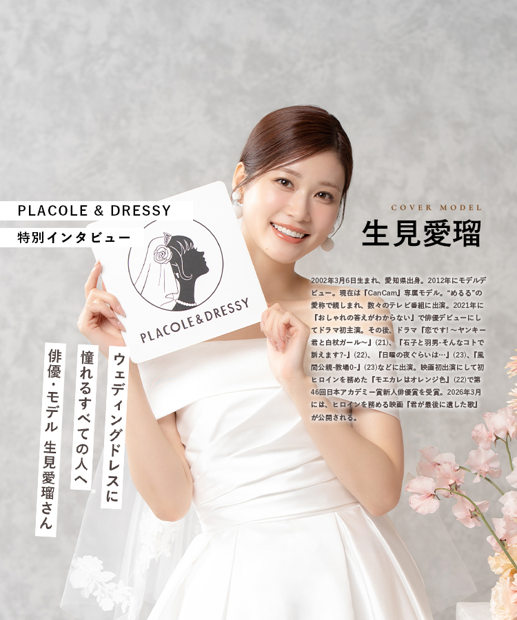3月号は俳優・モデルとして活躍する生見愛瑠さんがWANDSのウェディングドレスと、SACHIKO TSUTSUIのカラードレスを着て登場。着用したコーディネートのポイントやウェディングドレスの魅力、生見愛瑠さんについて DRESSY編集長 武藤みなみよりインタビューさせていただきました。