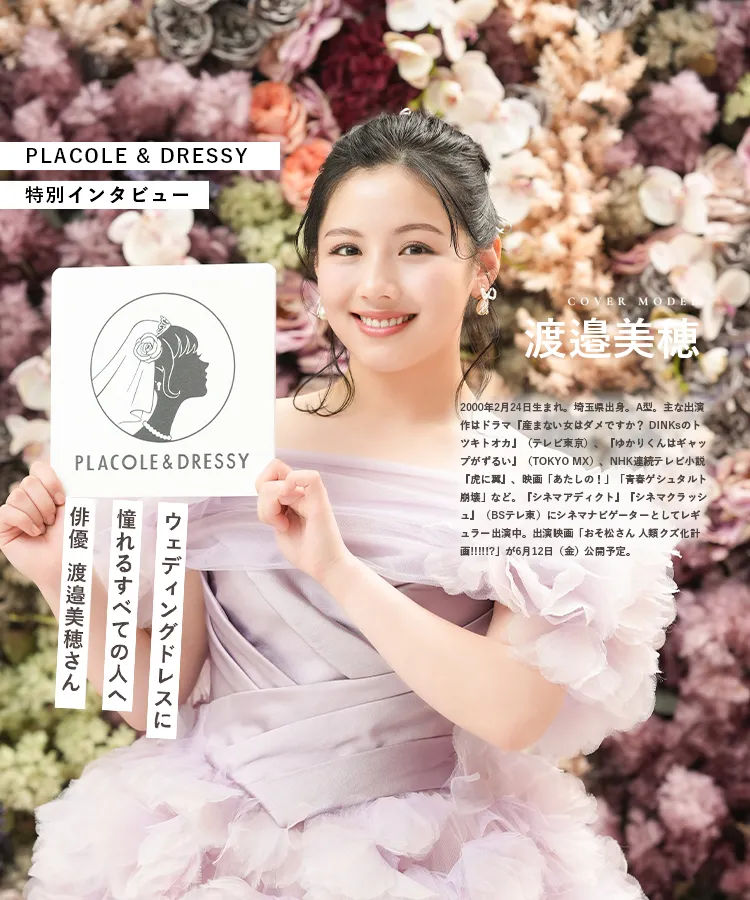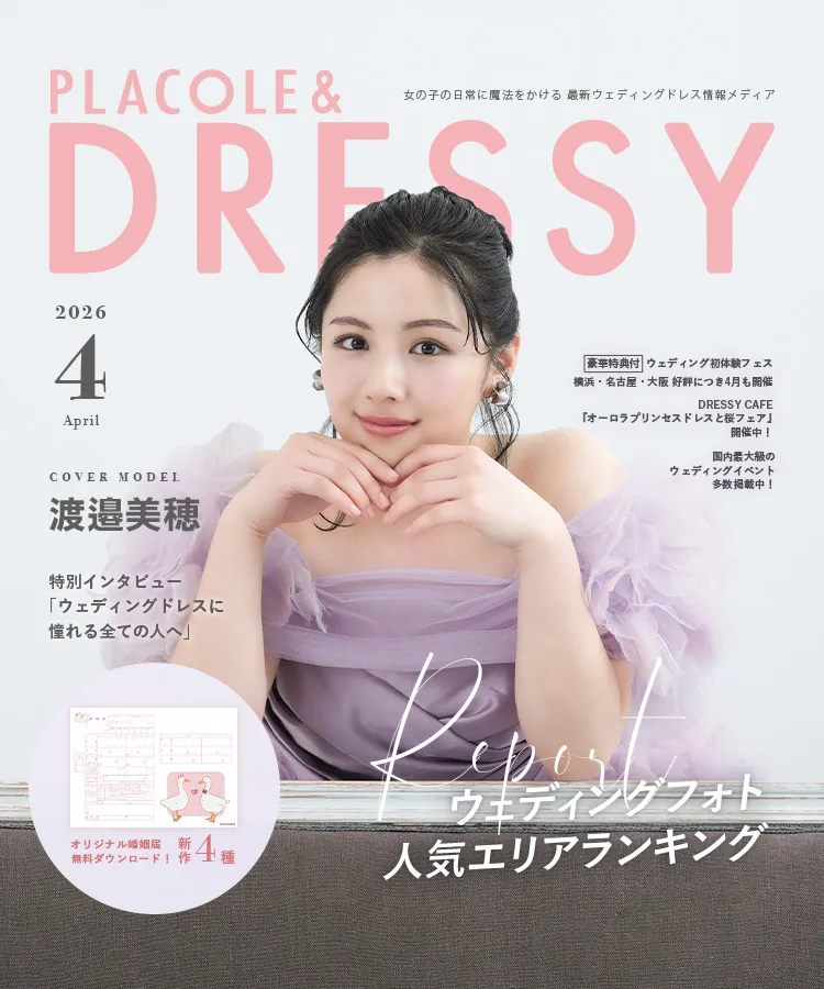 4月号は俳優として活躍する渡邉美穂さんがWANDSのウェディングドレスと、YUMI KATSURAのカラードレスを着て登場。着用したコーディネートのポイントやウェディングドレスの魅力、渡邉美穂さんについて DRESSY編集長 武藤みなみよりインタビューさせていただきました。