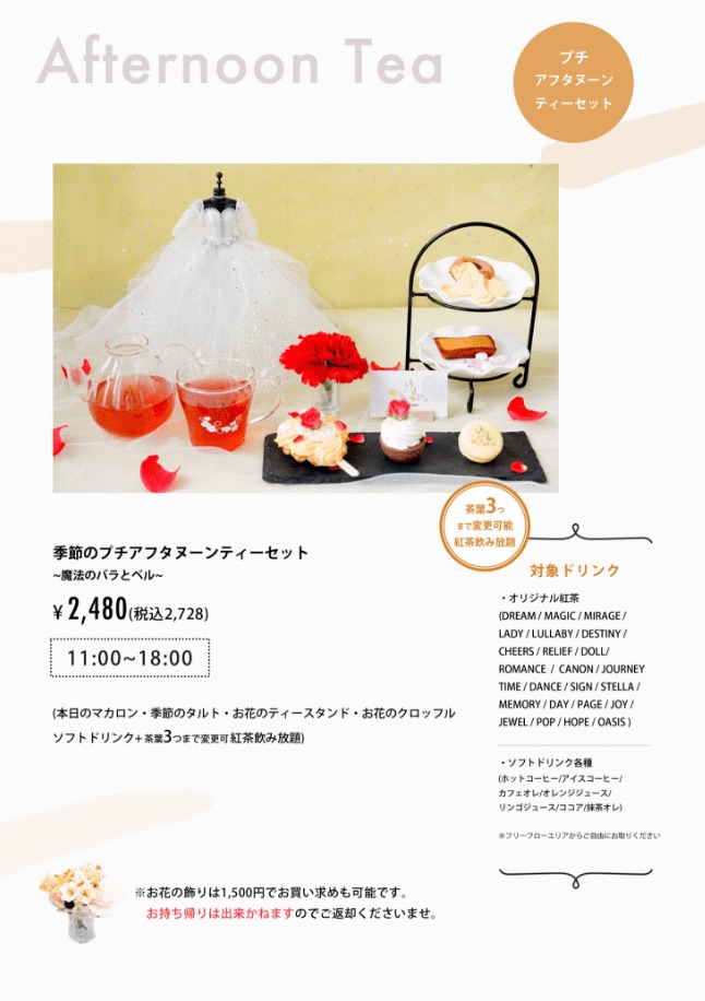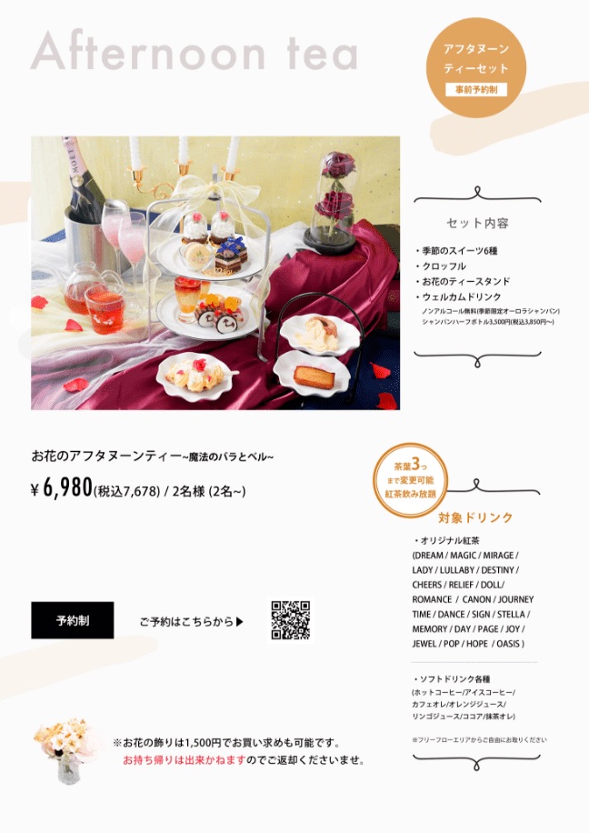 季節ごとのアフタヌーンティーは、4400円+サービス料。カフェのおかわりは90分制となります。
