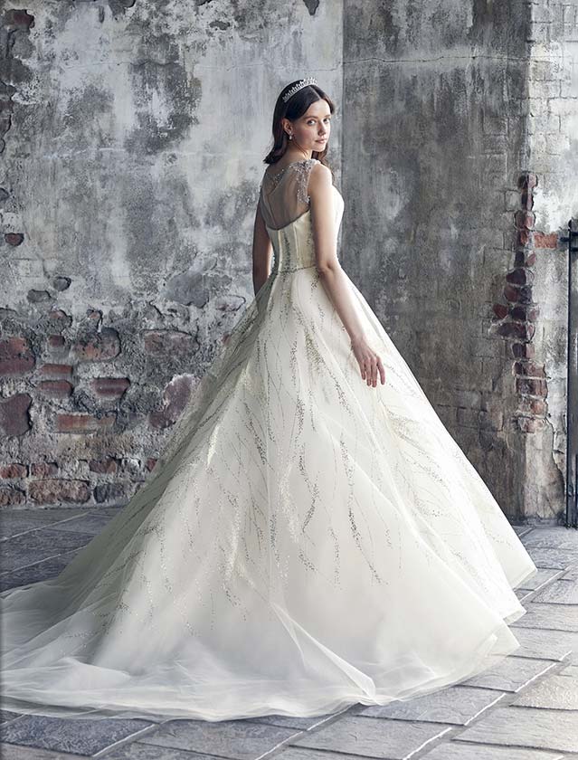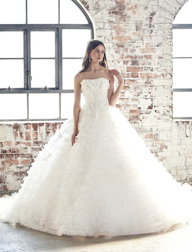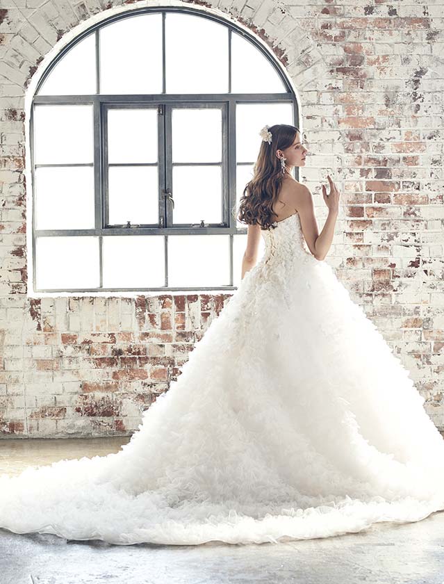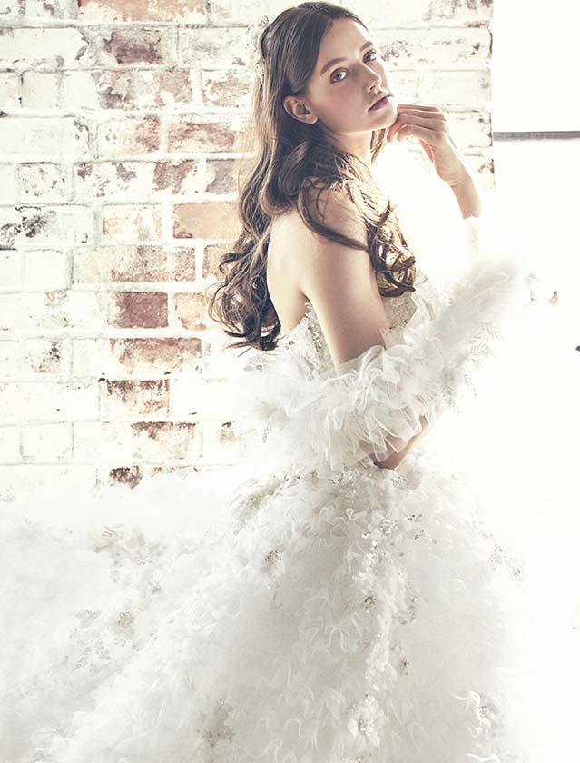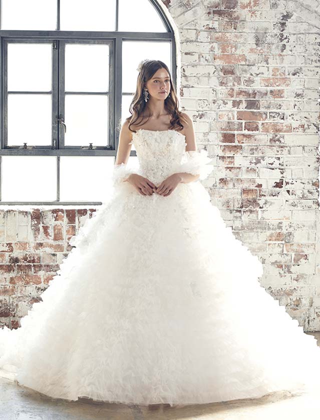 立体ビジューフラワーレースの輝きと、ソフトチュールのティアードの柔らかな流れ、そのすべてが花嫁さまを光で包み込むドレス。