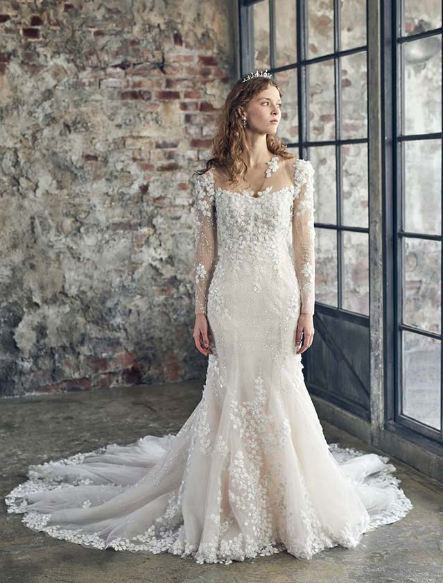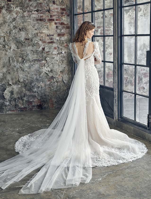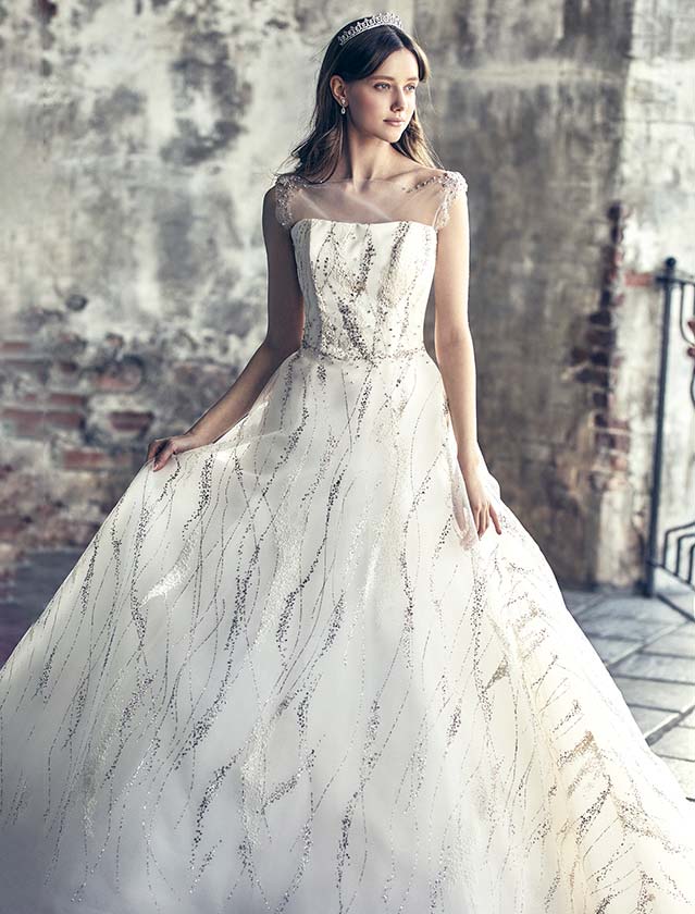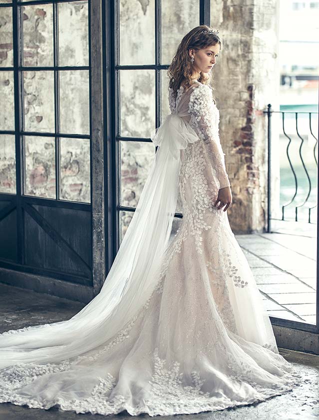 光がすべてを味方にして、優しいグリッターの輝きと、リーフレースが描く自然の美しさが、花嫁を優しく包み込みます。