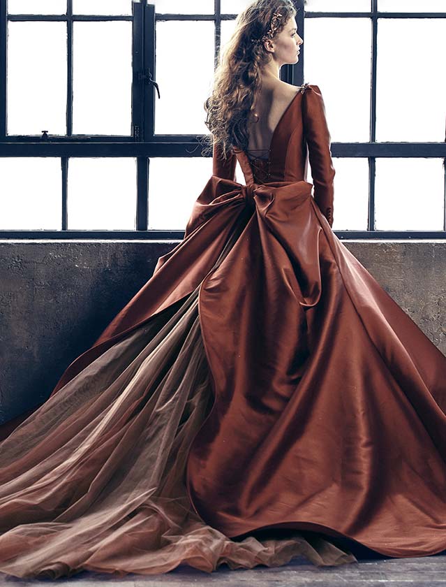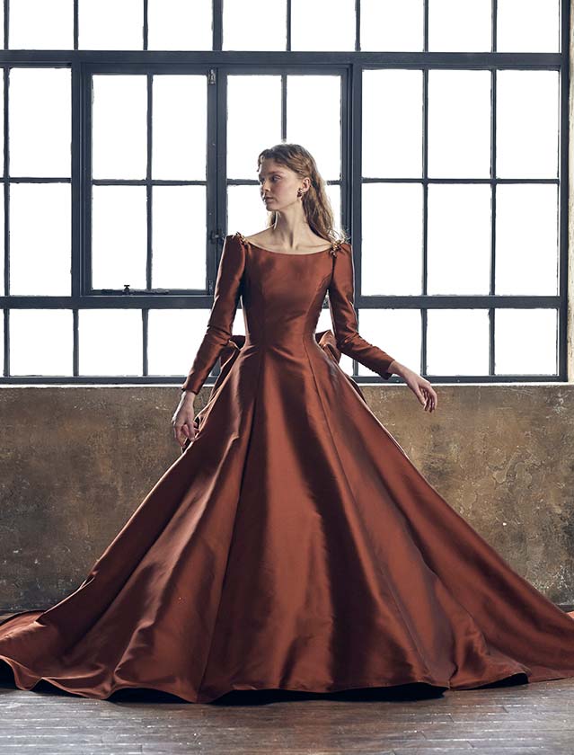 こちらのドレスはアイボリーとブラウンの2色展開。どちらも重厚感のあるドレスとなっています。