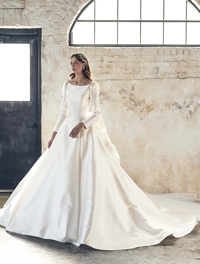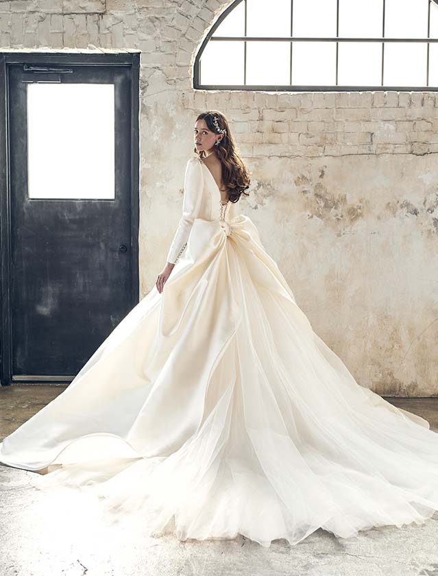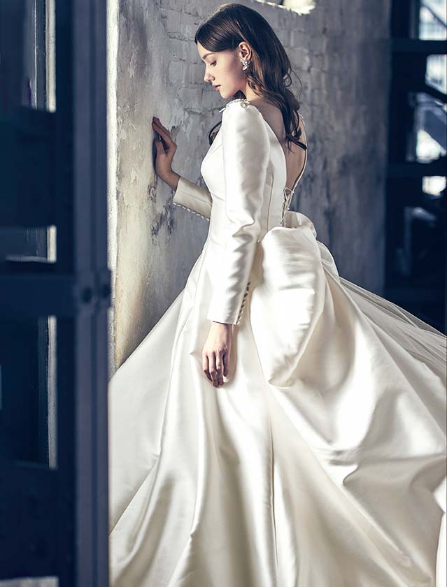 バックスタイルの流れるスカートラインは、どの角度からも完璧な品格のドレス。