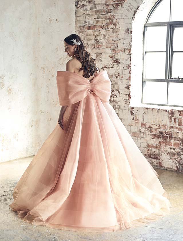 バックのリボンショールも透明感ある仕上がりで、花嫁の優しさ、愛らしさを表現させたとびきりフォトジェニックな一着です。