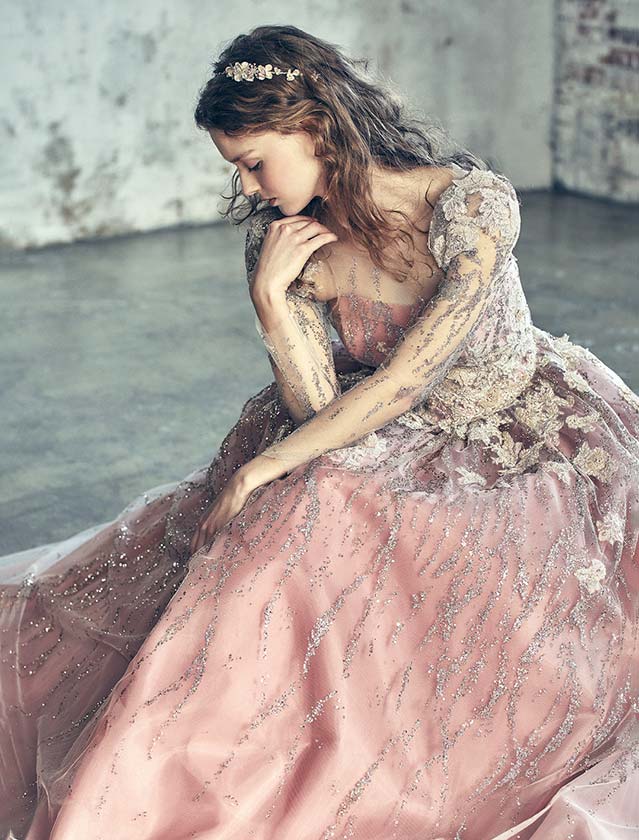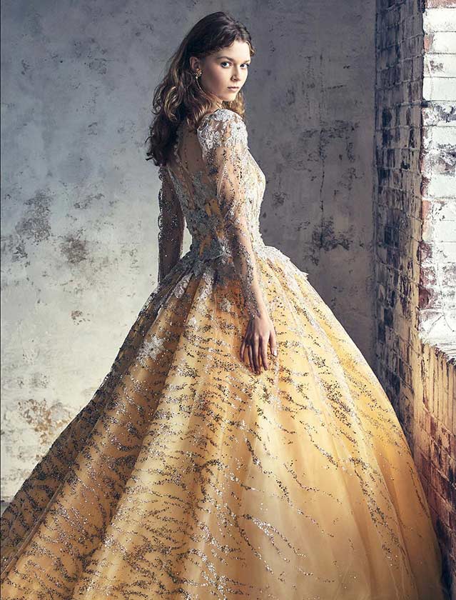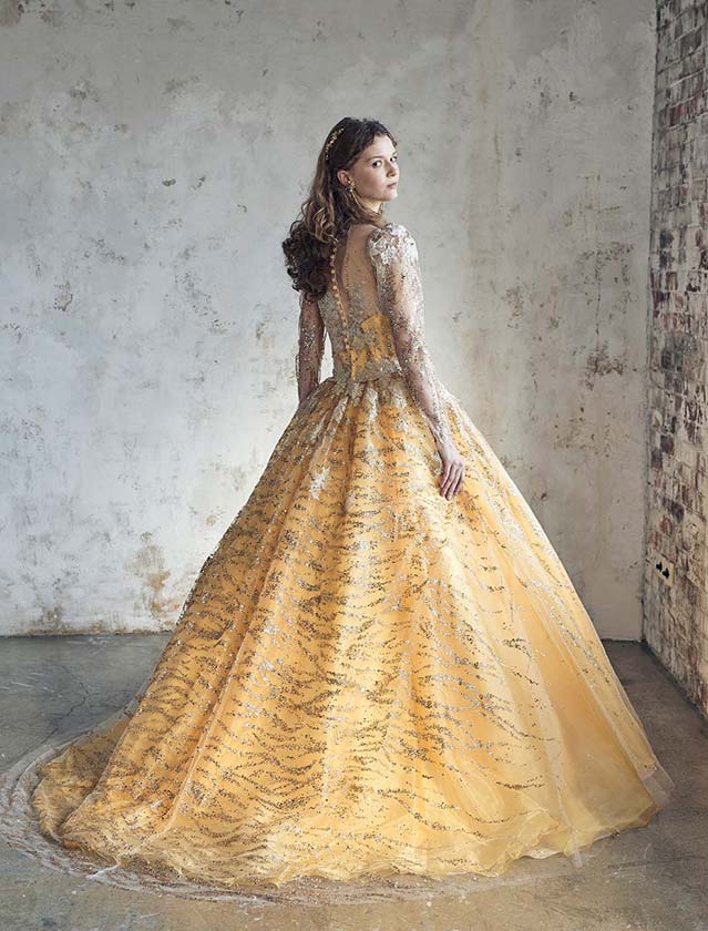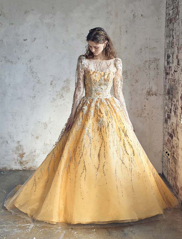 グリッターのきらめきにラメレースを重ねることで、立体感と深みのある輝きを表現。人気のパフロングスリーブはオーバーブラウス仕様で、シンプルなビスチェに変化する2wayデザインです。