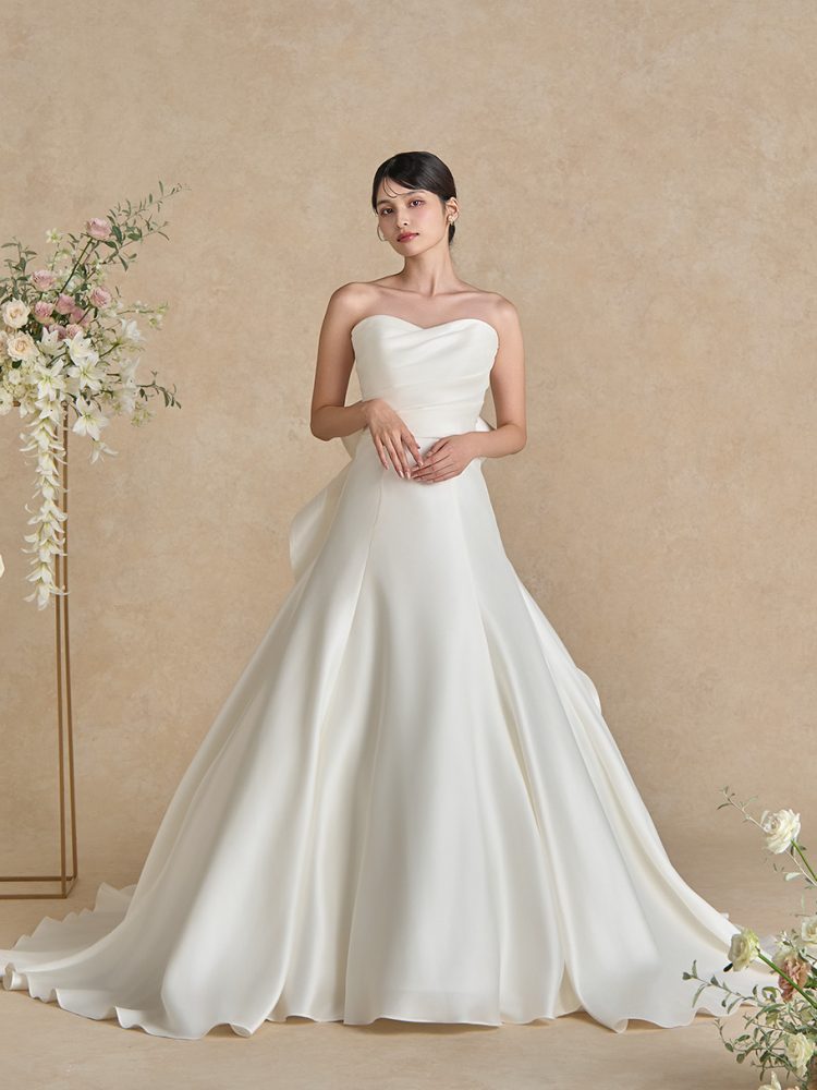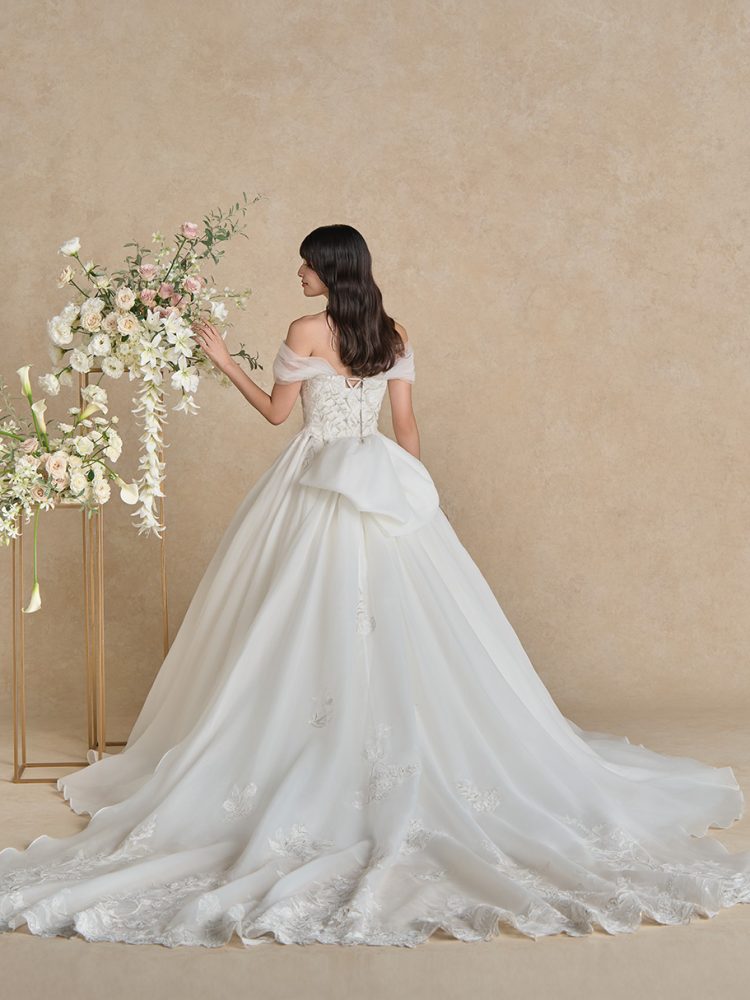 エアリーなオーガンジースカートが描く柔らかな光と陰影が花嫁を気高くしなやかに包み込みます。