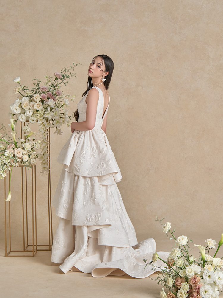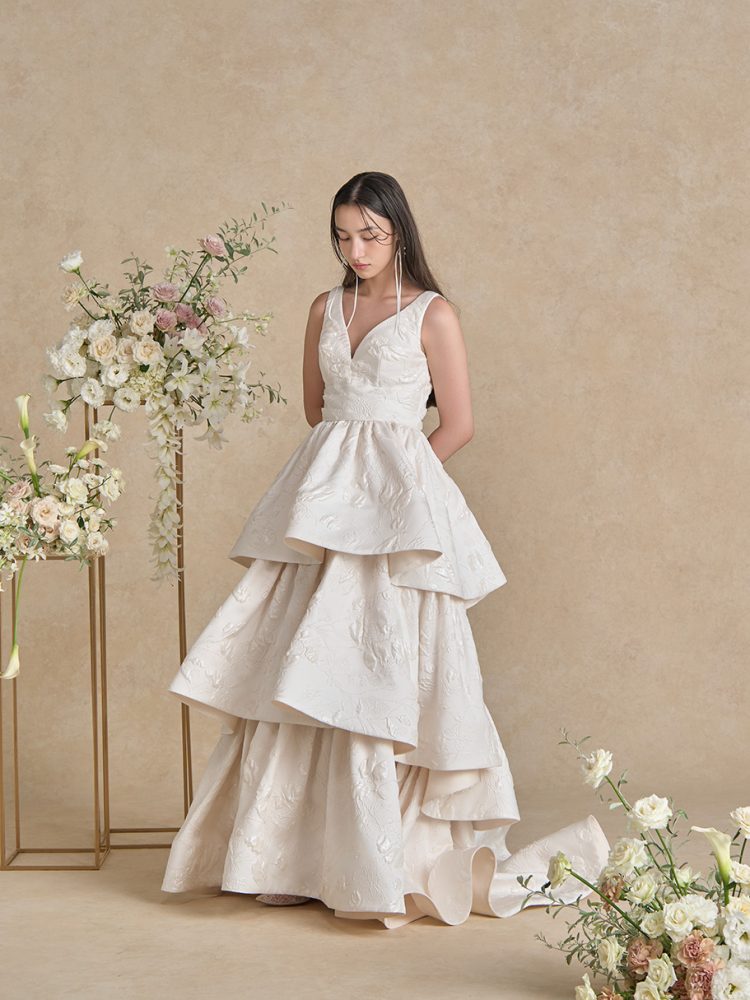 三段に重ねたティアードスカートが構築的なシルエットを描きクラシックとモダンが美しく調和した一着です。