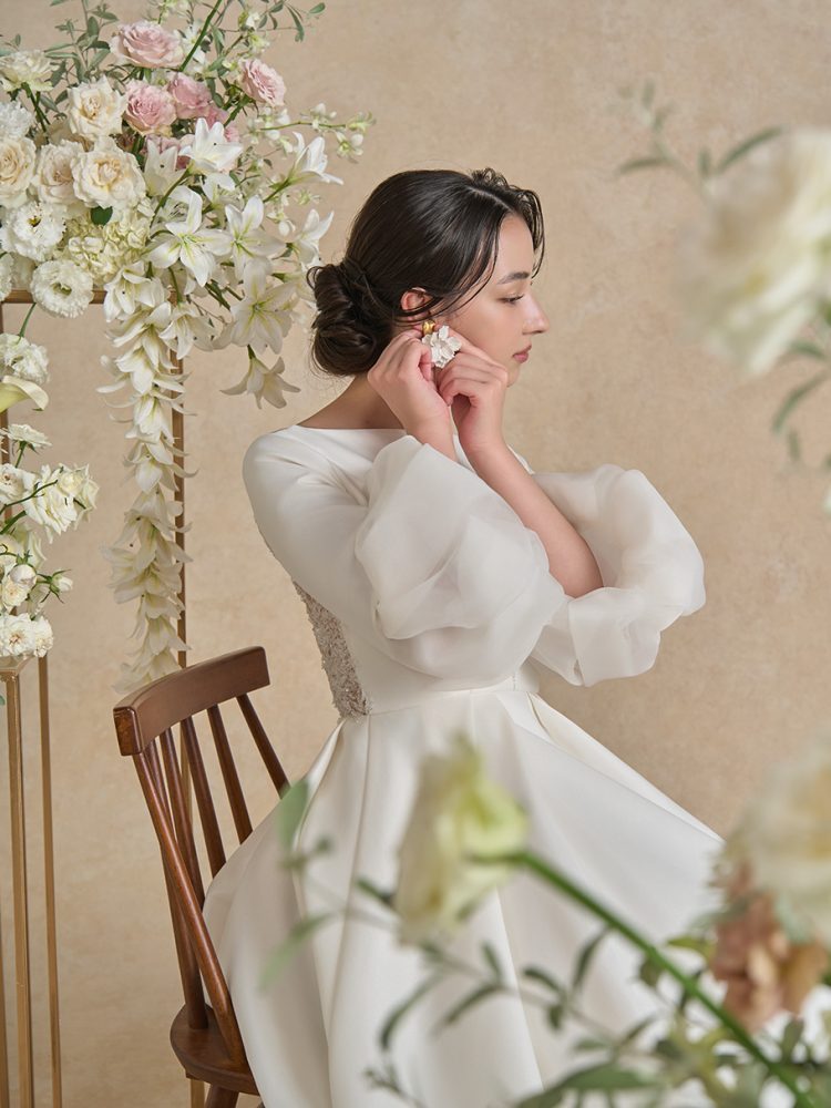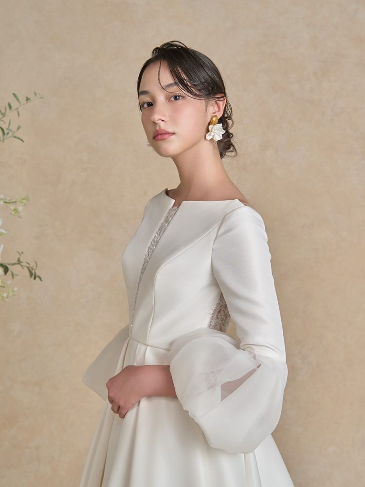 オーガンジーで仕立てたパゴダスリーブが、軽やかなエレガンスを添えます♡