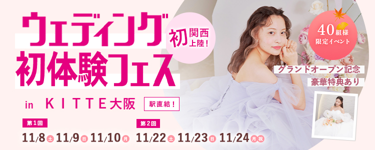 01. お客様情報の入力(必須) お名前 / ふりがな ※名前は必須項目です お相手様のお名前 / ふりがな メールアドレス ※メールアドレスは必須項目です 電話番号 ※電話番号は必須項目です 02. 参加希望日時(必須) 参加希望日程 選択してください11月8日(土)11月9日(日)11月10日(月)11月22日(土)11月23日(日)11月24日(月祝) 参加希望時間 選択してください10:3011:3012:3013:3015:3016:3017:3018:30 当日のご参加人数 選択してくださいお一人でお相手様とお二人でお子様と一緒にご友人やご家族と一緒に未定 検討状況を教えて下さい。 選択してください①式場見学先を探している②式場見学済みだが他にも見学したい③婚約済み。まだ何も決めていない④婚約に向けて2人で情報収集中⑤フォト/前撮りのみ相談したい⑥オリジナルドレス購入希望(試着1000円) \関西初上陸!グランドOPEN記念の特別体験型式場相談フェス/