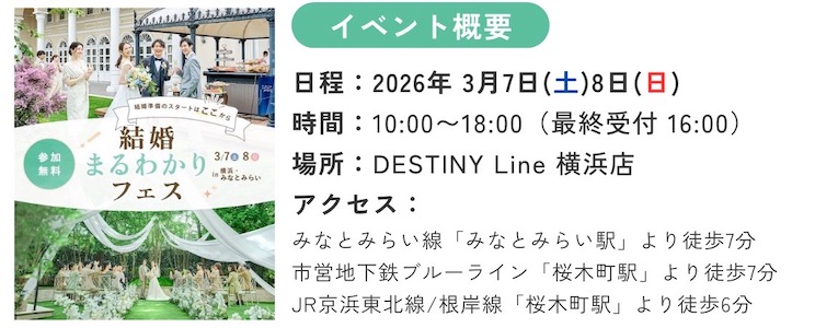 01. お客様情報の入力(必須) ふりがな ※名前は必須項目です お名前 ※ふりがなは必須項目です メールアドレス ※メールアドレスは必須項目です 電話番号 ※電話番号は必須項目です 02. フェスタのご予定について フェスタ参加日を教えてね!(第一希望) 選択してください3月7日(土) 10:003月7日(土) 12:003月7日(土) 14:003月7日(土) 16:003月8日(日) 10:003月8日(日) 12:003月8日(日) 14:003月8日(日) 16:00 フェスタ参加日を教えてね!(第二希望) 選択してください3月7日(土) 10:003月7日(土) 12:003月7日(土) 14:003月7日(土) 16:003月8日(日) 10:003月8日(日) 12:003月8日(日) 14:003月8日(日) 16:00 検討状況を教えて下さい。 選択してください①式場見学済みだが他も見たい②式場見学先を探している③婚約済。まだ何も決めてない④婚約に向けて2人で情報収集中 招待予定人数を教えてください。(複数選択可) おふたり〜20名30〜50名60〜100名100名以上未定 結婚式の検討時期はいつですか?(複数回答可) 半年以内1年以内1年半以内2年以内未定 ※本イベントは式場検討中の方向けのイベントとなります。式場決定済みの方はご参加いただけません。 \結婚まるわかりフェスに行く/