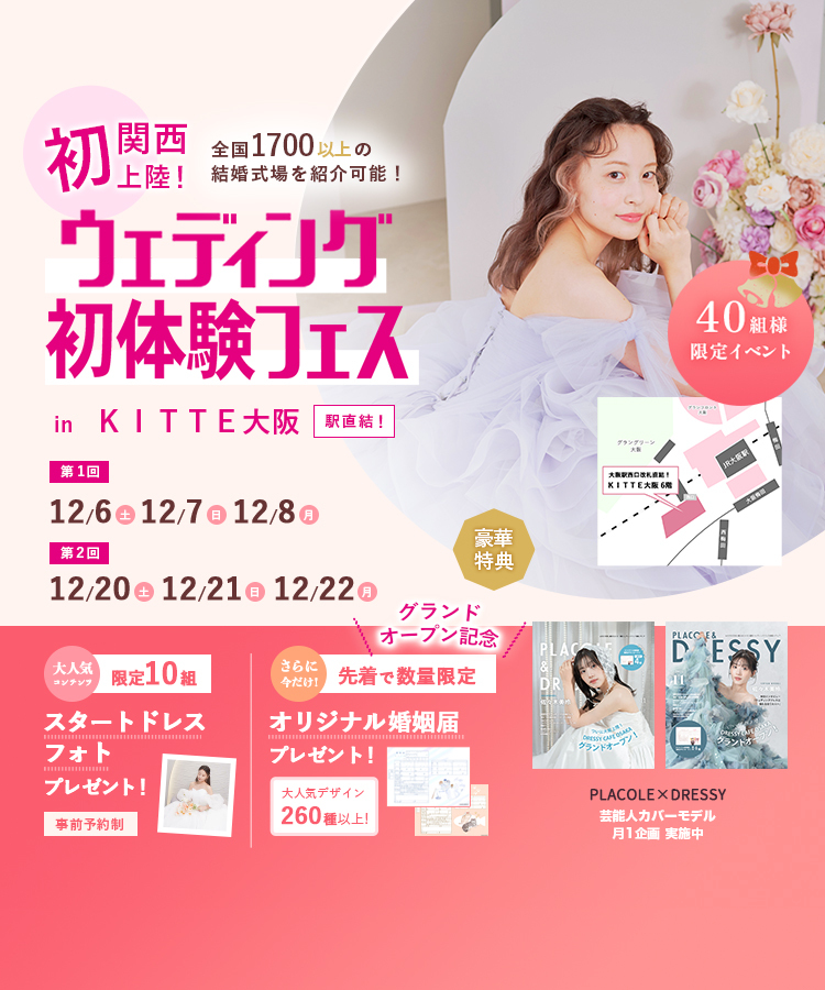 【12/6(土),7(日),8(月)限定プレオープン!】関西初上陸!<大阪駅直結>結婚式場相談やスタートドレスフォト、前撮りも相談できちゃう♡ウェディング初体験フェス in 大阪⚐