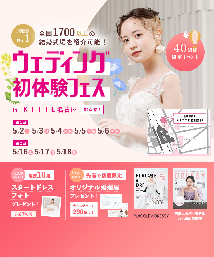 【3/20(金祝),21(土),22(日),23(月)限定!】特典付き!<名駅直結!>結婚式場相談やスタートドレスフォトもできちゃう♡ウェディング初体験フェス in KITTE名古屋⚐