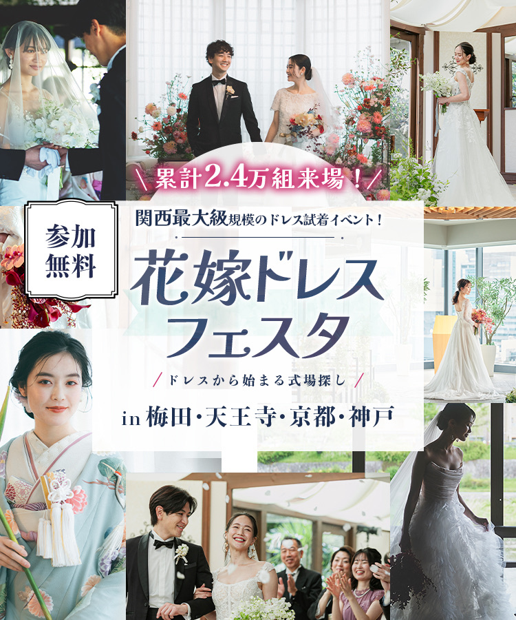 【枠数限定】関西最大級のドレス試着イベント!21大体験を楽しみながら式場探し♡<花嫁ドレスフェスタ~ドレスから始まる式場探し~> 開催決定 ⚐