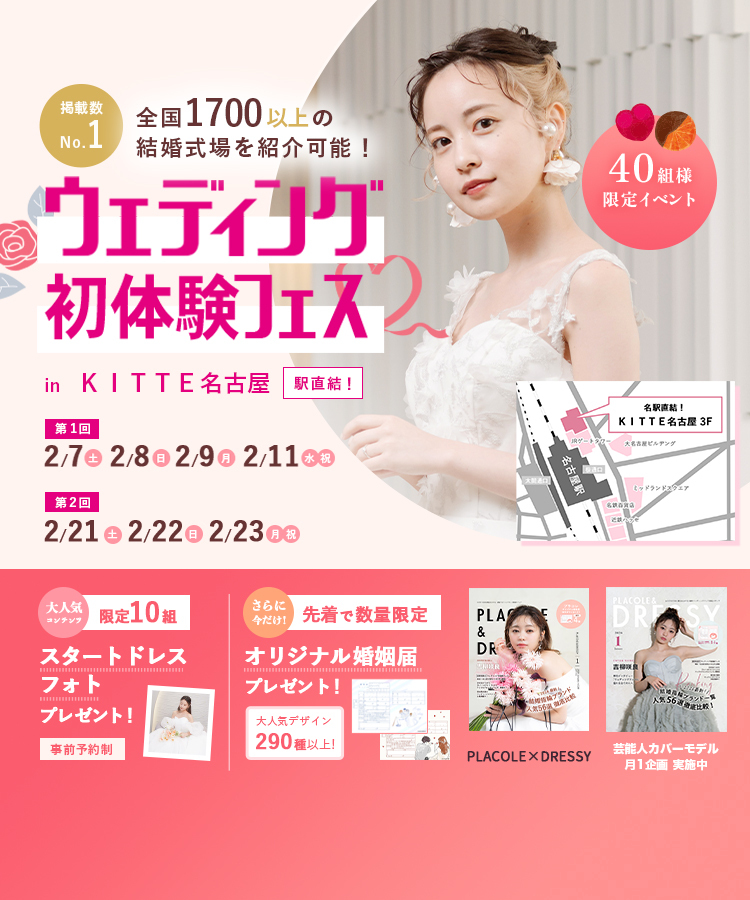 【2/7(土),8(日),9(月),11(水祝)限定!】特典付き!<名駅直結!>結婚式場相談やスタートドレスフォトもできちゃう♡ウェディング初体験フェス in KITTE名古屋⚐