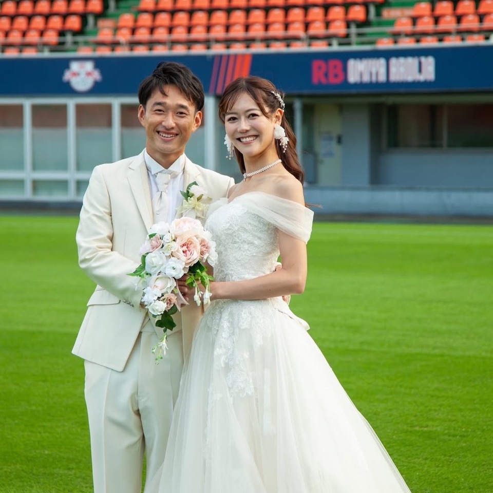 RB大宮アルディージャの谷内田哲平選手とフリーアナウンサーの佐藤由菜さんがNACK5スタジアム大宮でのウェディングフォトを披露!新婚密着動画もチェックして♡