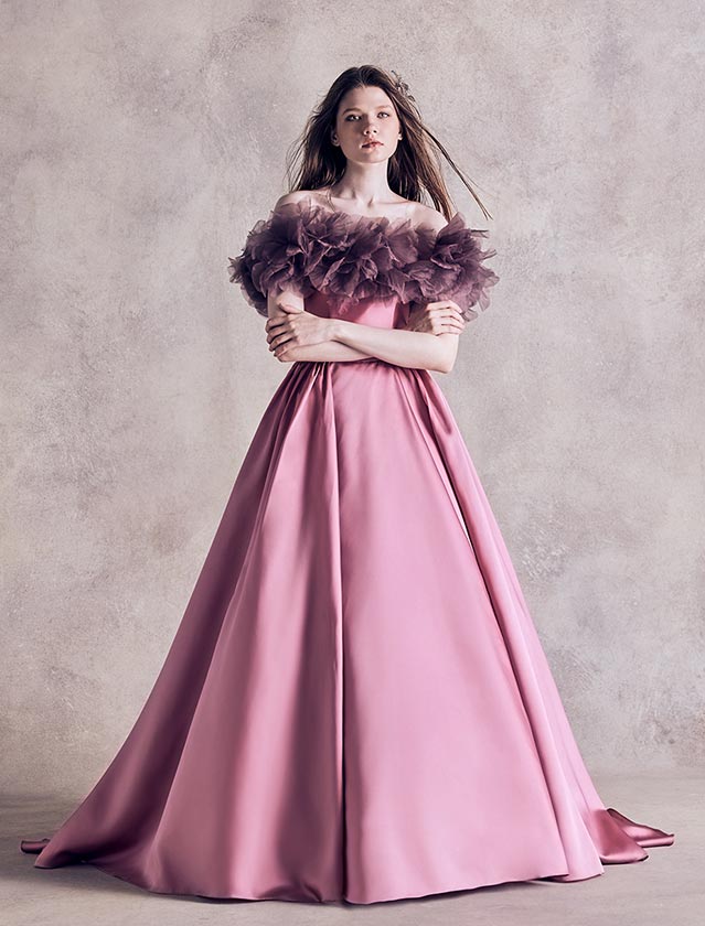 ふんわりと広がるオーバードレスと肩に咲く立体フラワーが、特別な一日をもっと特別に。