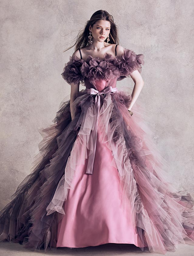 ふんわりと重ねたチュールのオーバードレスと、立体的なフラワーショールが主役級の存在感を放つドレス。