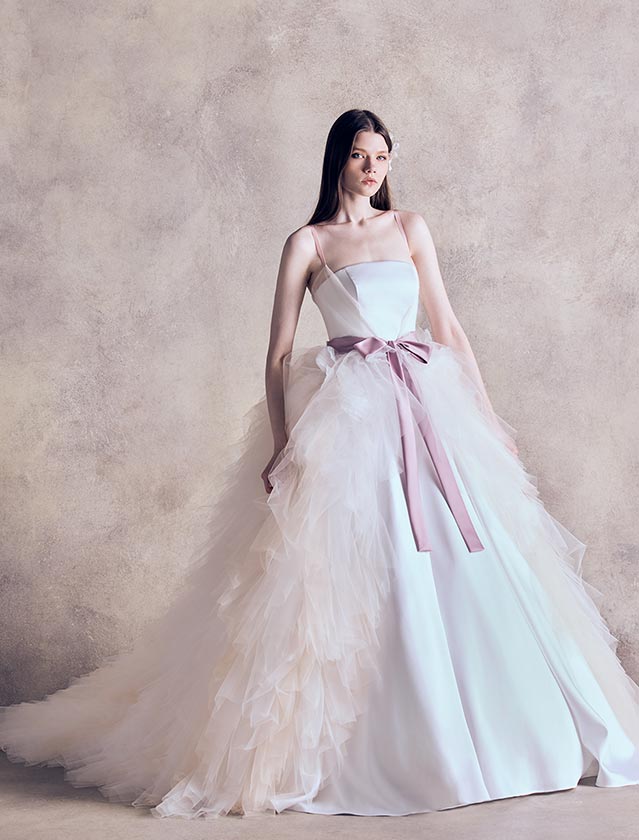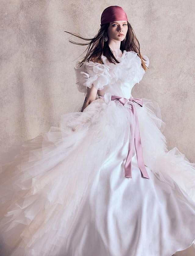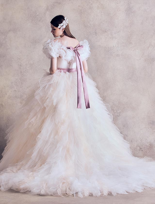 ふっくらとした立体ショールに、儚く広がるチュールトレーン。動くたびに空気を含んで広がるその姿は、まさに花そのもの♡