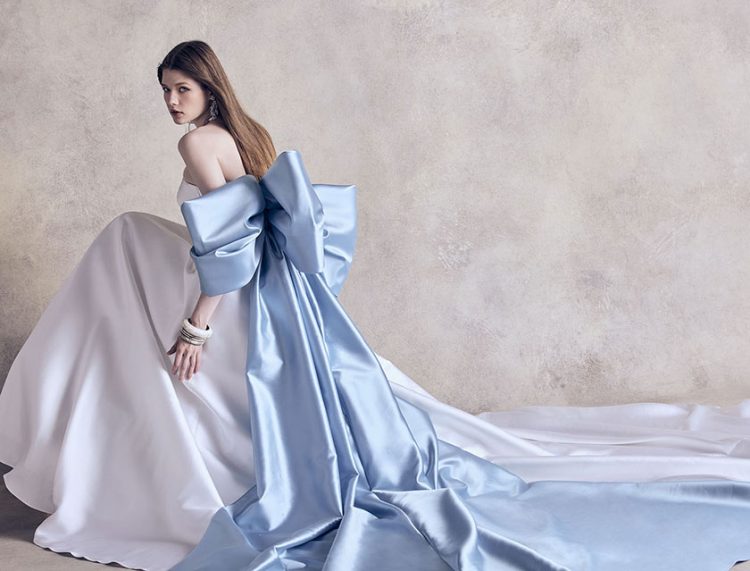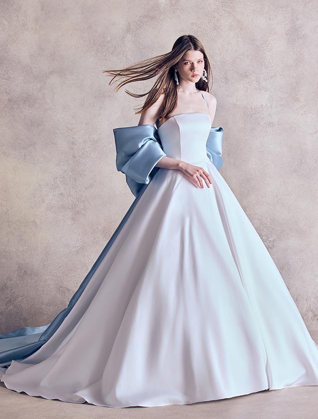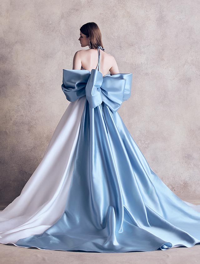 柔らかに輝くブルートーンと構築的なリボンのコントラストが今っぽいコーディネートを実現!リボントレーンは他のドレスのもON出来る万能アイテムです。