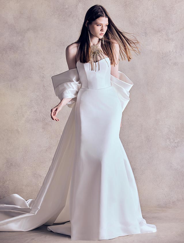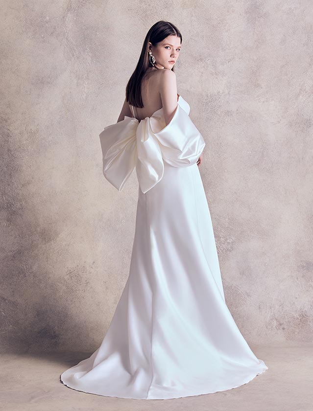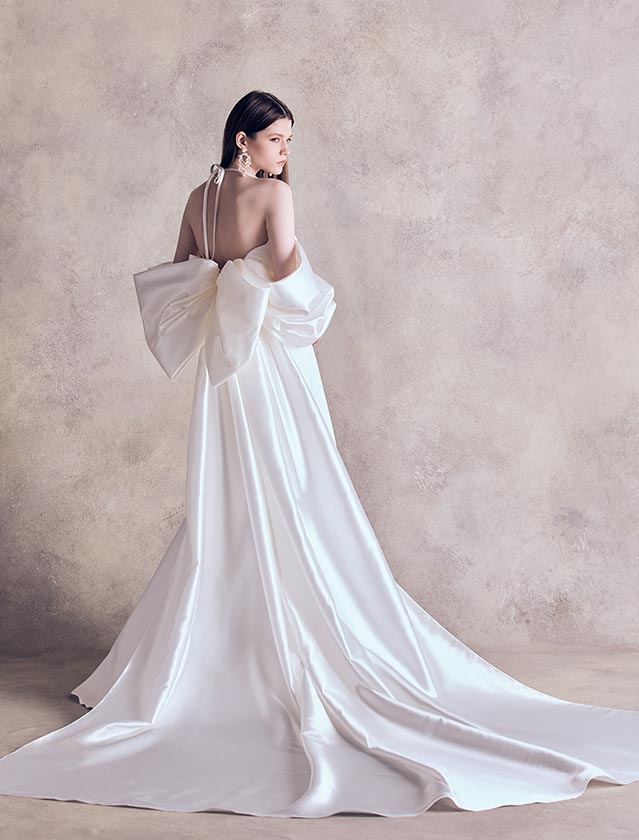 張り感のあるミカド素材がつくる洗練されたシルエットに、ふんわりと広がるボリュームスリーブがモードなエッセンスを添えるリボントレーン。