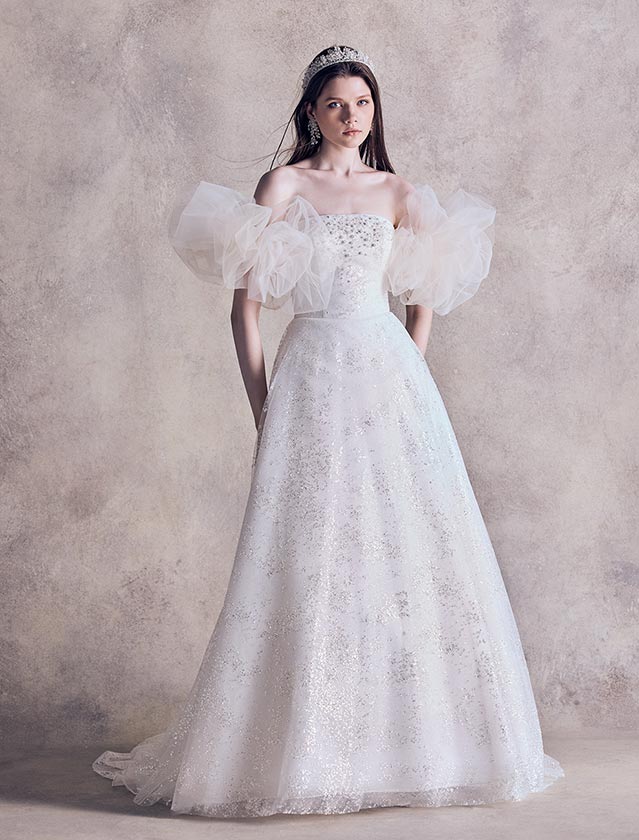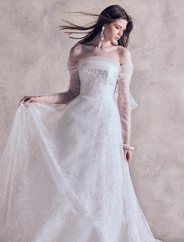 ホワイトグリッターの輝き、甘さを抑えた大人の花嫁に向けた、モードな表情も魅力!