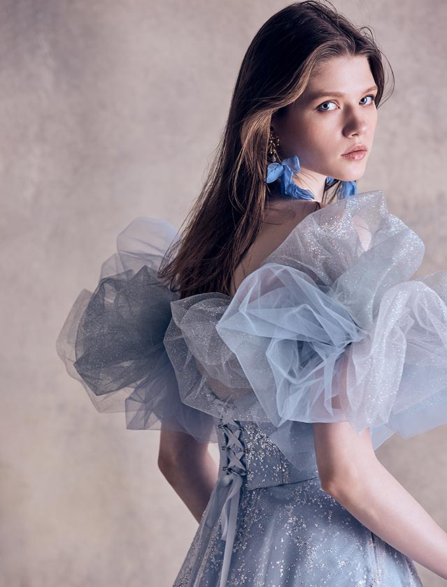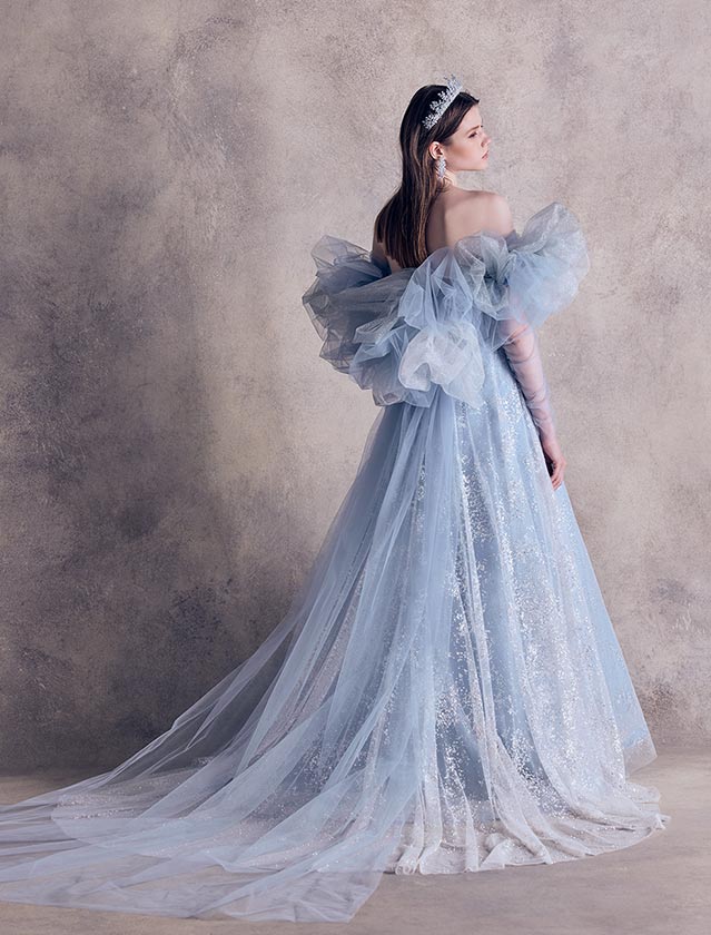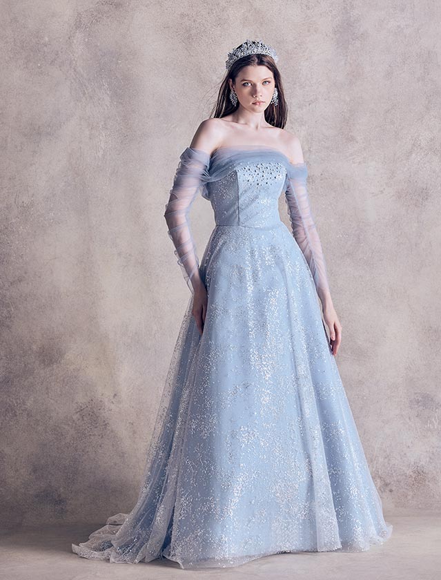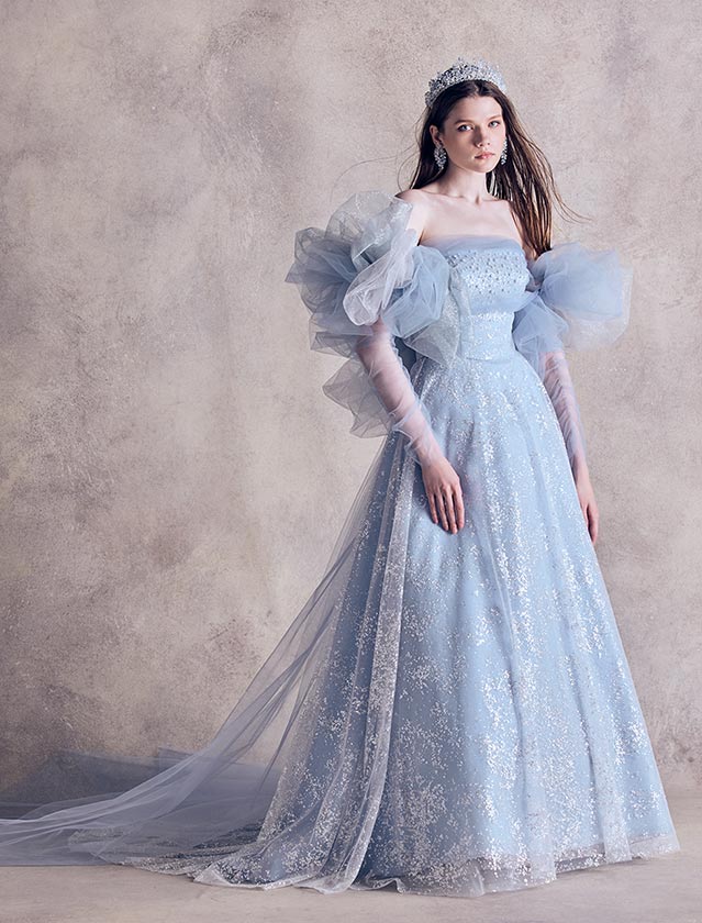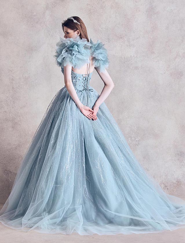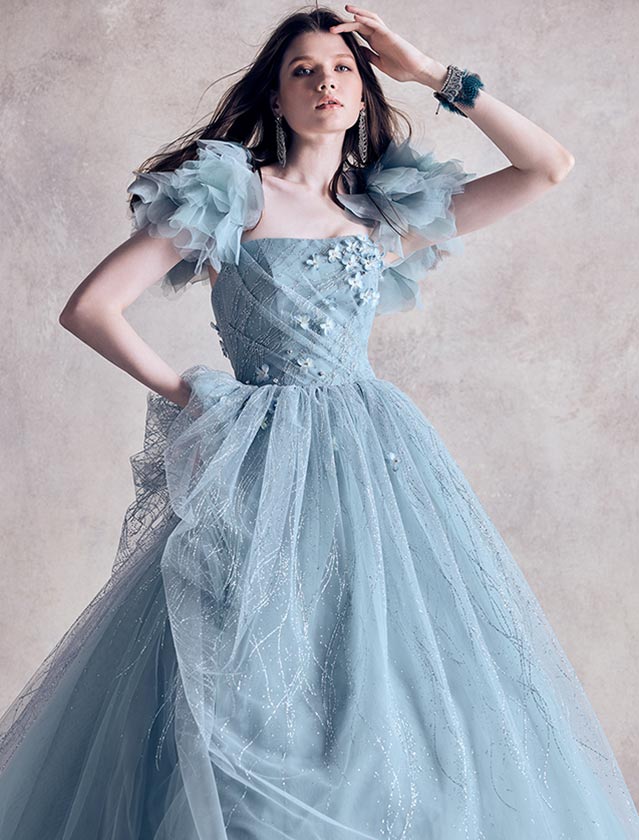 一瞬で世界を凍らせる美の魔法。雪が舞い降りる瞬間をドレスに閉じ込めたような、幻想的なホワイトブルーのドレス。
