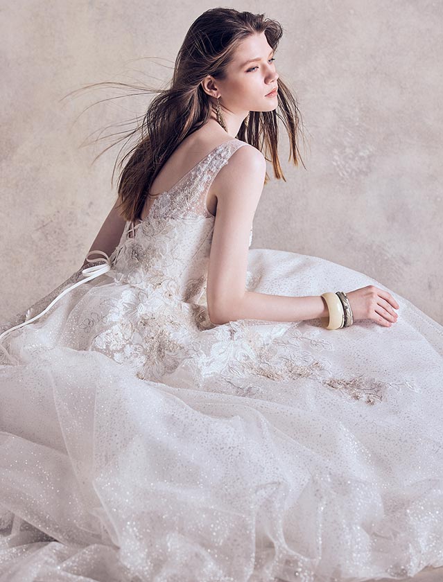 立体的なレースワークと抜け感のある背中のデザインが、可憐さの奥にある芯の強さを引き出すドレスは、ただ美しいだけでは終わらない、洗練を極めた一着です。