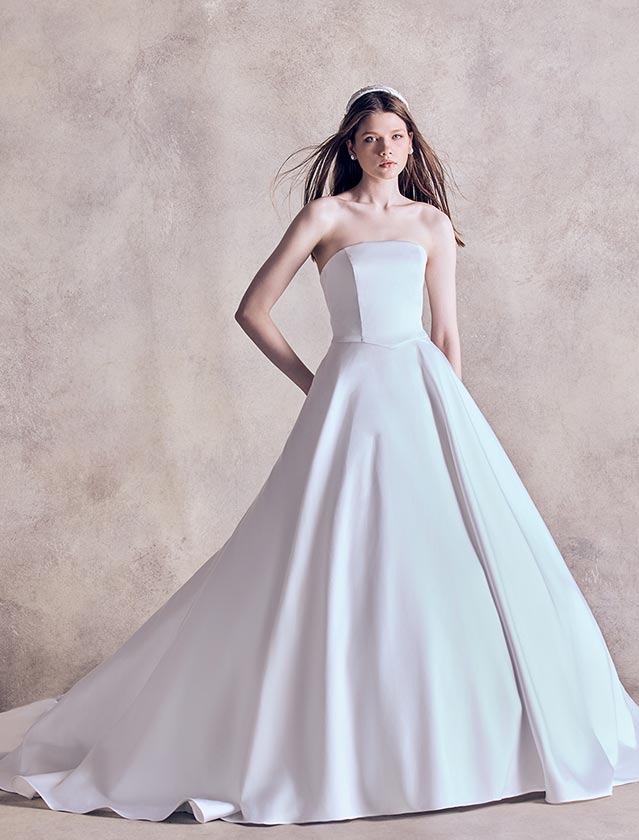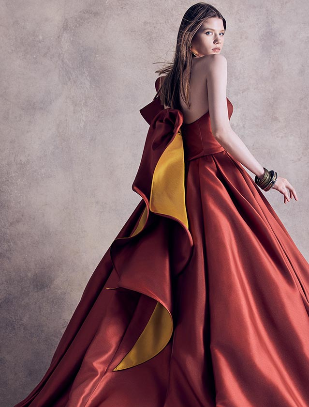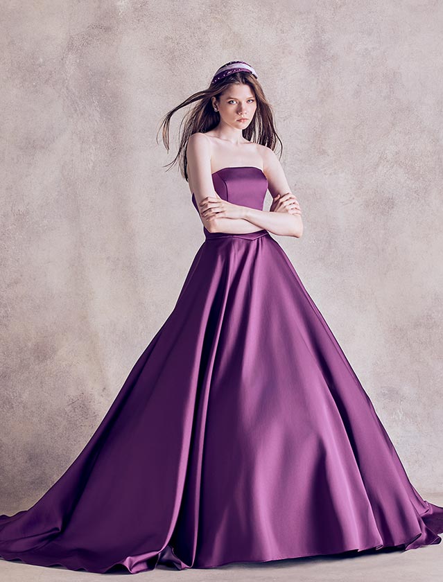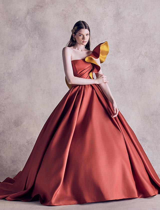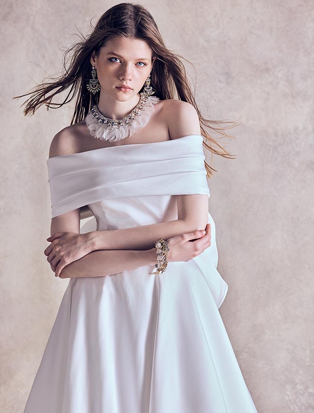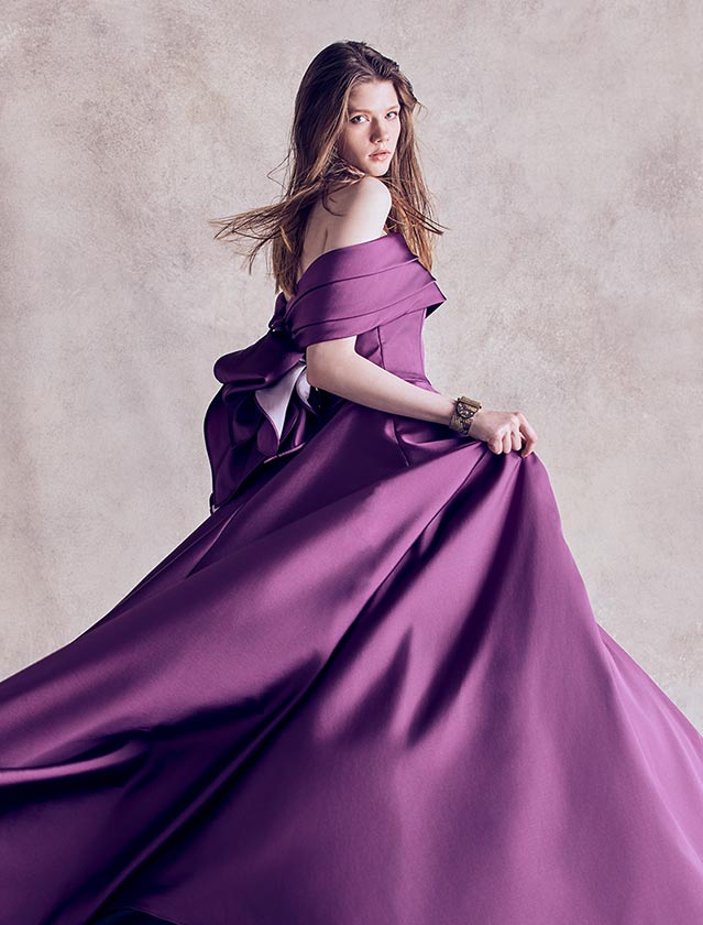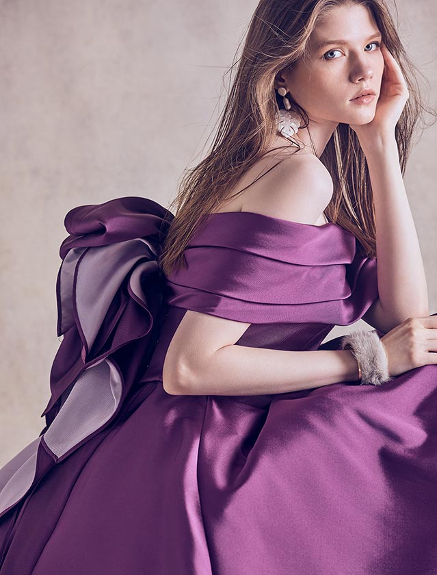 纏うたびに気づく研ぎ澄まされた美。インポートサテンの持つ透明感のある艶、贅沢にフエアを取ったボリュームスカート、そして取り外し可能なショールが生むニュアンスのある着こなしが叶います。