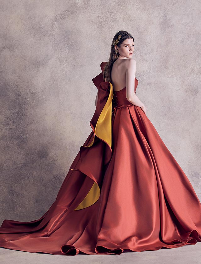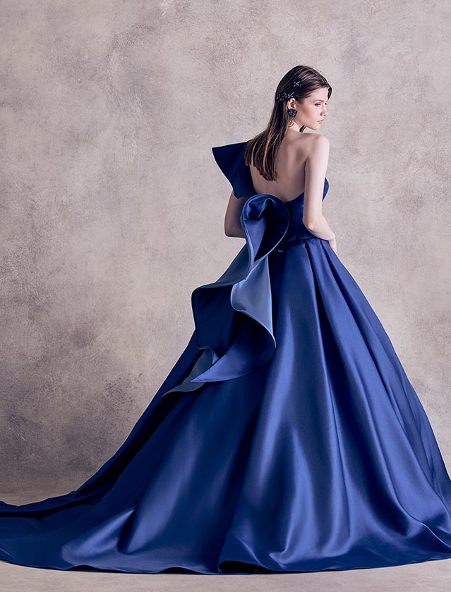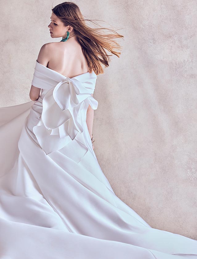 一見シンプルに見えて緻密に計算された構築的なシルエットと、バックスタイルに施されたラッフルが、印象的な余韻を残します。