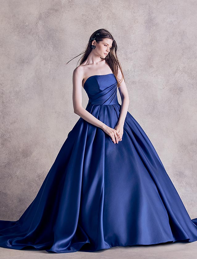 凛とした輝きを放つのは、上質なミニマリズム。シルクのような光沢を湛えるインポートサテンが、動くたびに柔らかく光りを返し、たっぷりと分量を取ったスカートが、優雅な広がりを描くドレス。