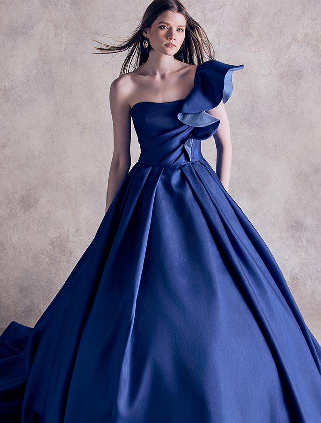 深みのある2色のミカドサテンを贅沢に使用し、ドラマティックなワンショルダーフリルと大胆なバックスタイルで視線を奪うドレス♡