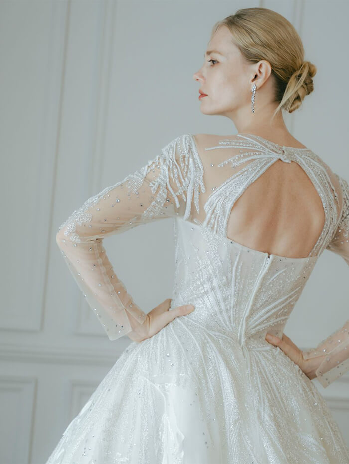 幾重にも重ねられた素材によるボリューム感あるスカート、シースルー素材の上見頃、繊細に刺繡された袖が幻想的なボディラインを描き出します。