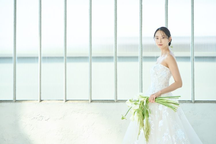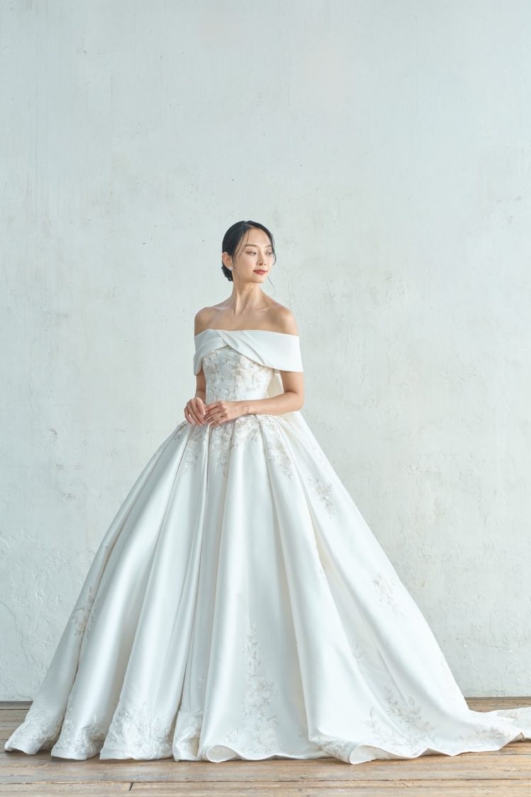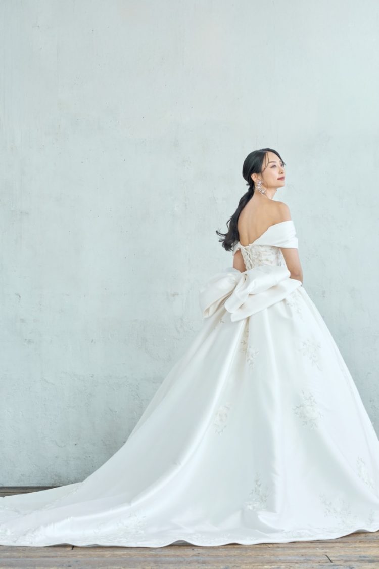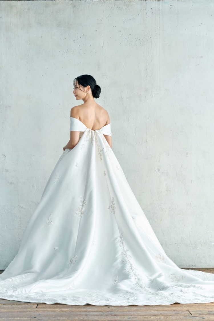 糸色まで厳選して織り上げたレースは、光の加減で表情を変え、上質な煌めきを放ちます。オフショルダー、ワトートレーン、バックリボンは取り外し可能。カスタム自由なマルチウェイドレスです。