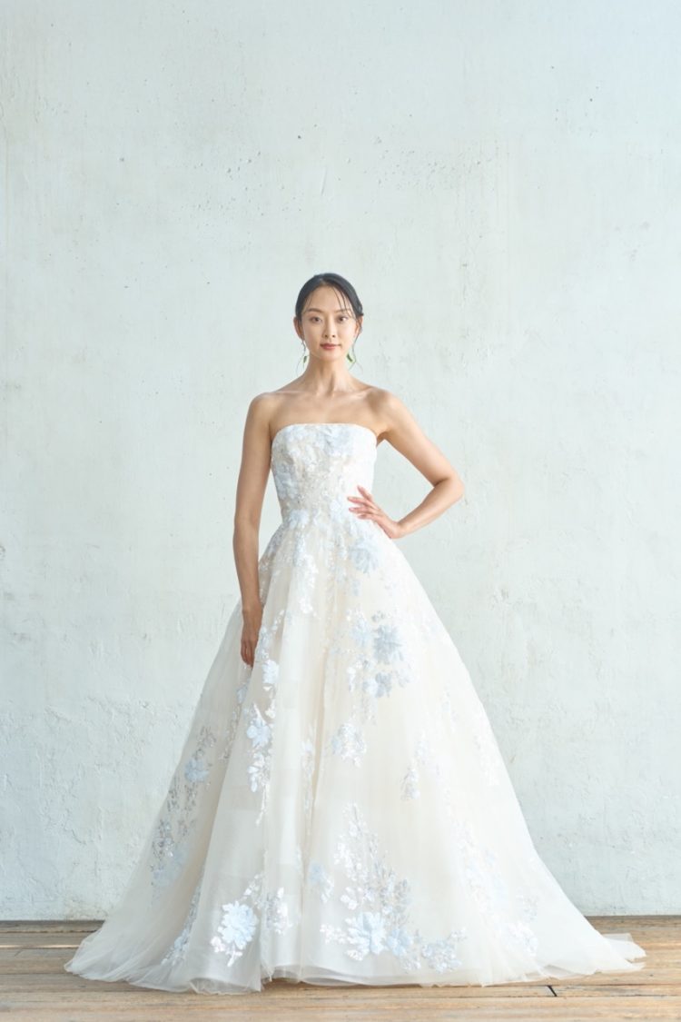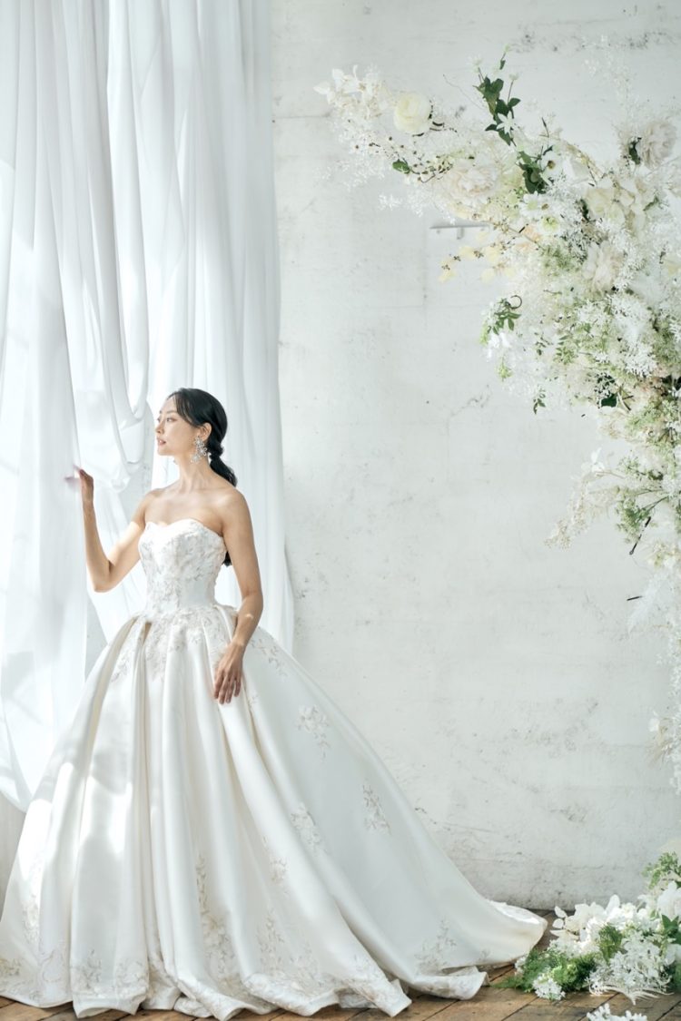 クリアと乳白のスパンコールを繊細に重ねることで刺繍に立体感を生み、光と陰影のニュアンスを与え、洗練された優雅な佇まいを演出したドレスです。
