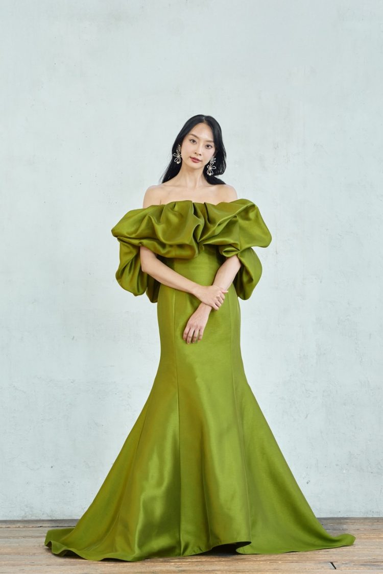サテン仕立てのマーメイドカラードレス。最大の魅力は、注目の「バルーンスリーブショルダー」!オンショルダー、ワンショルダーどちらでもお楽しみいただけます。