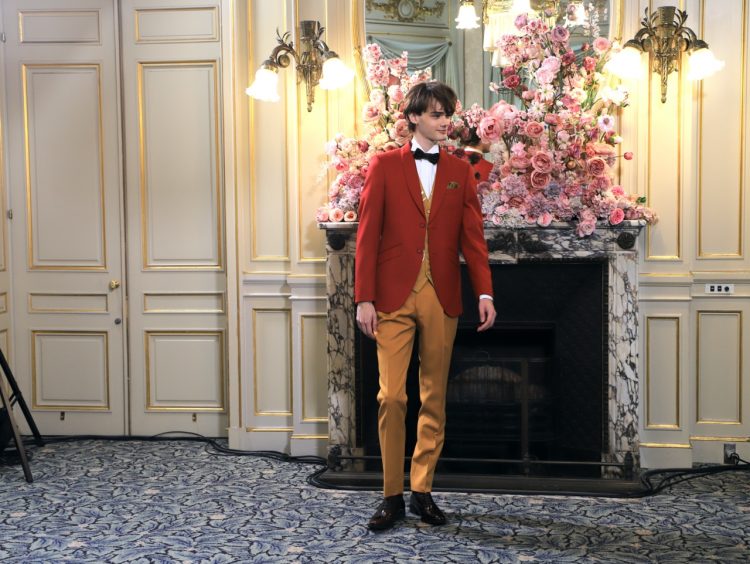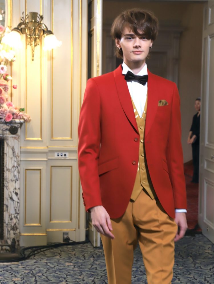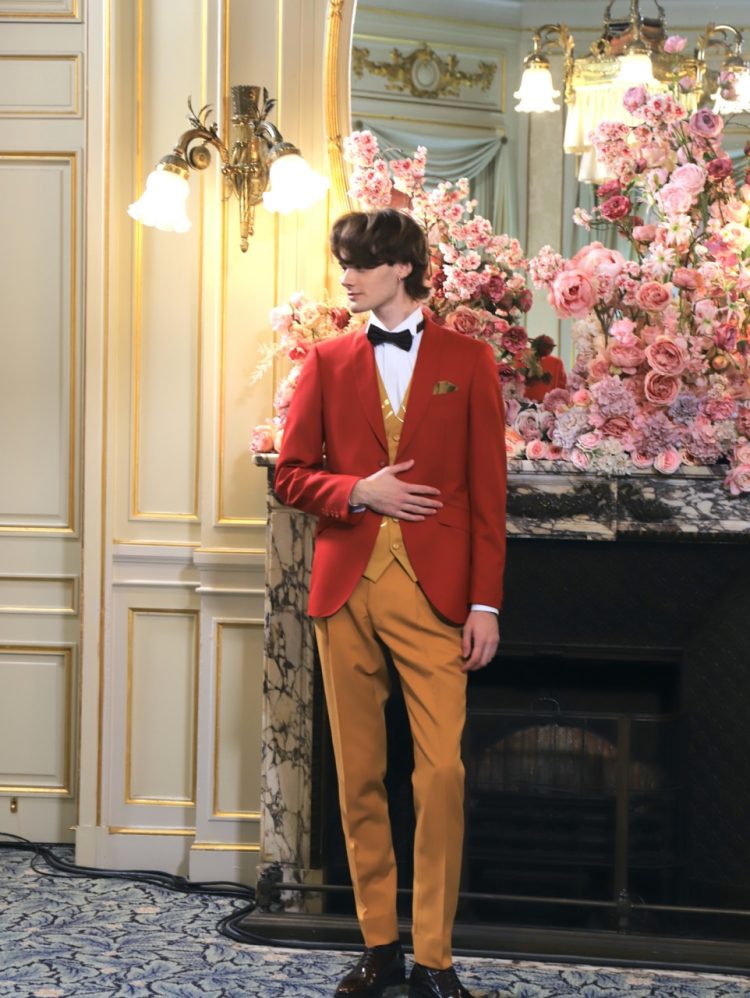 深みのある赤のジャケットとブラウンでクラシックな雰囲気もあるくまのプーさんからインスパイアされたタキシード。