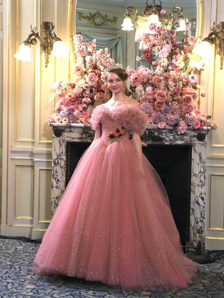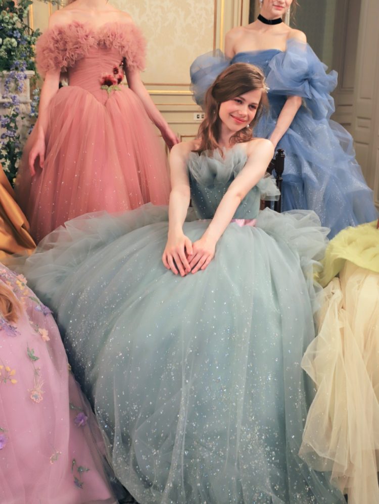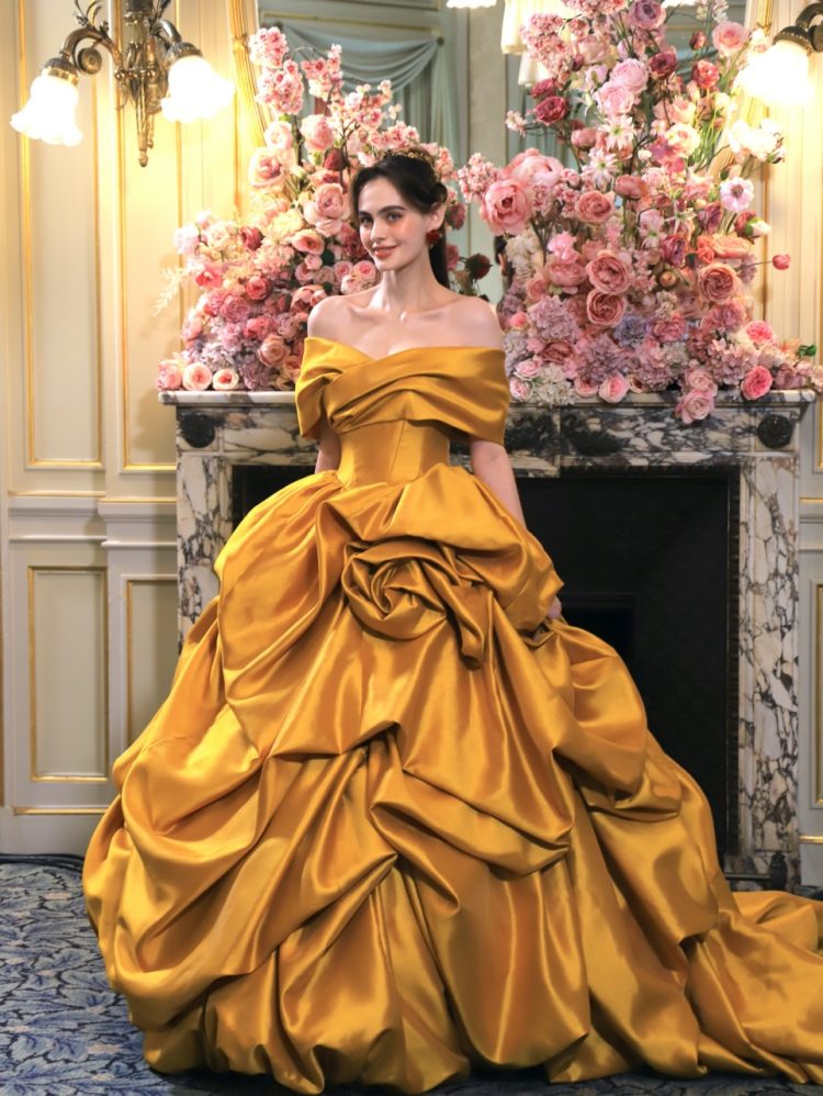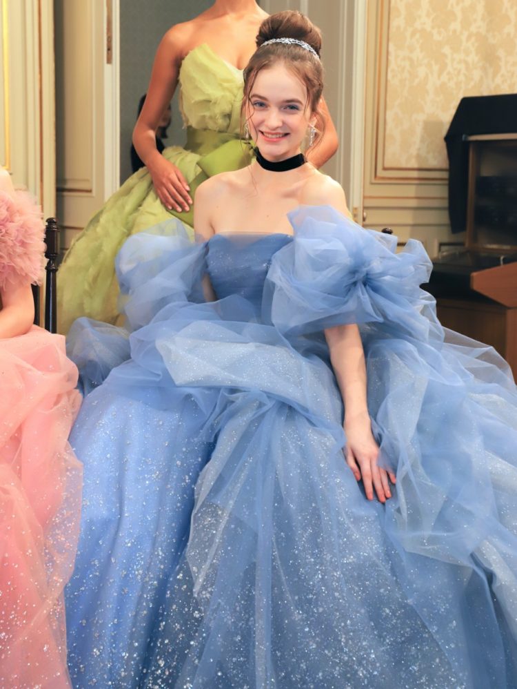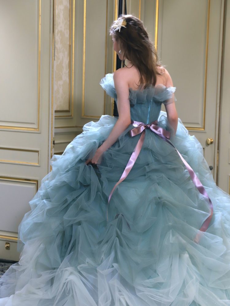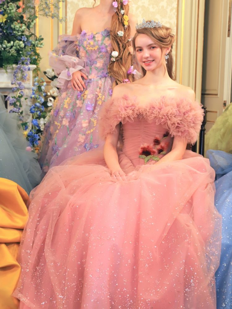 オフショルダーのデザインも、まさに物語のベルのドレスです。