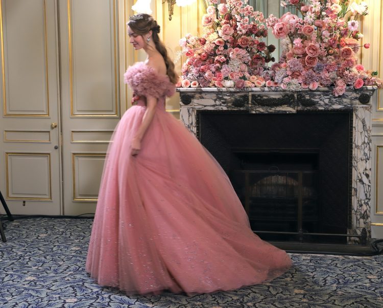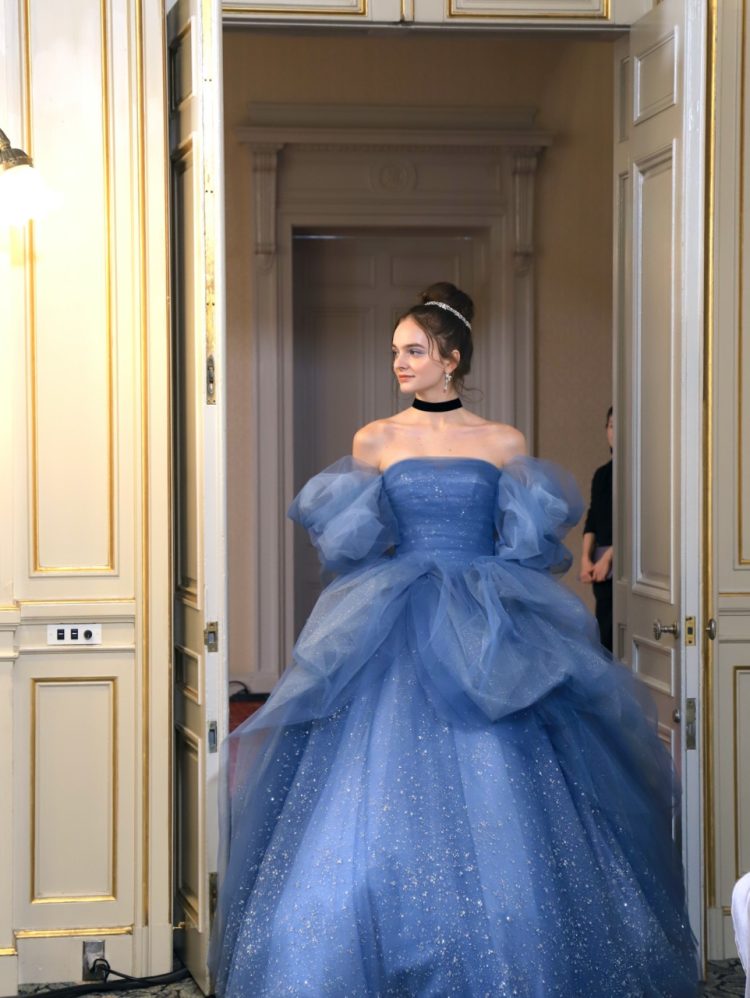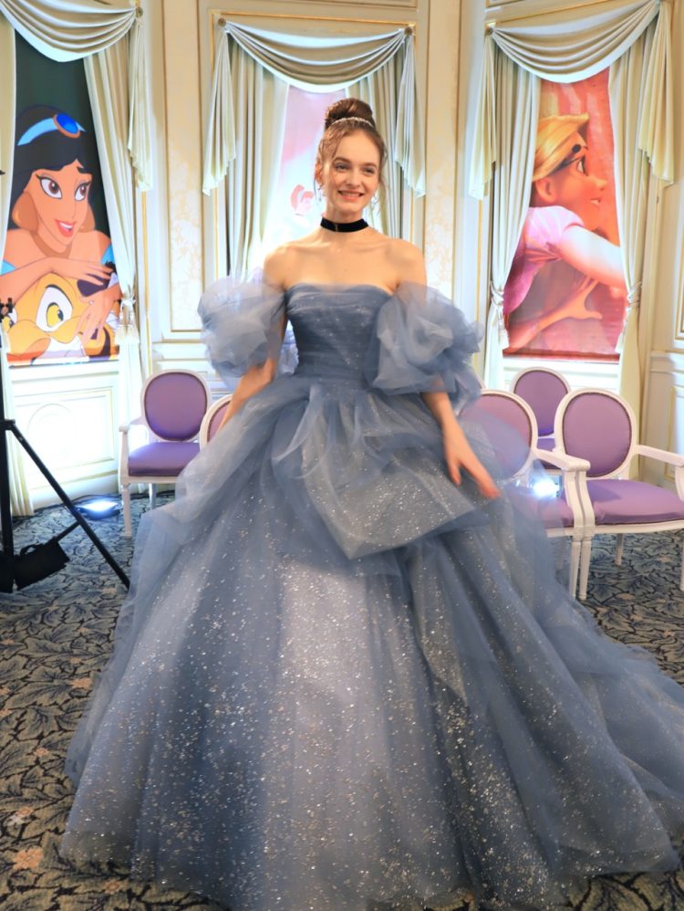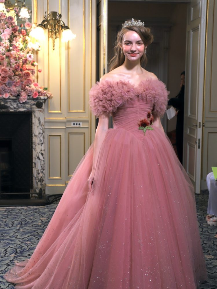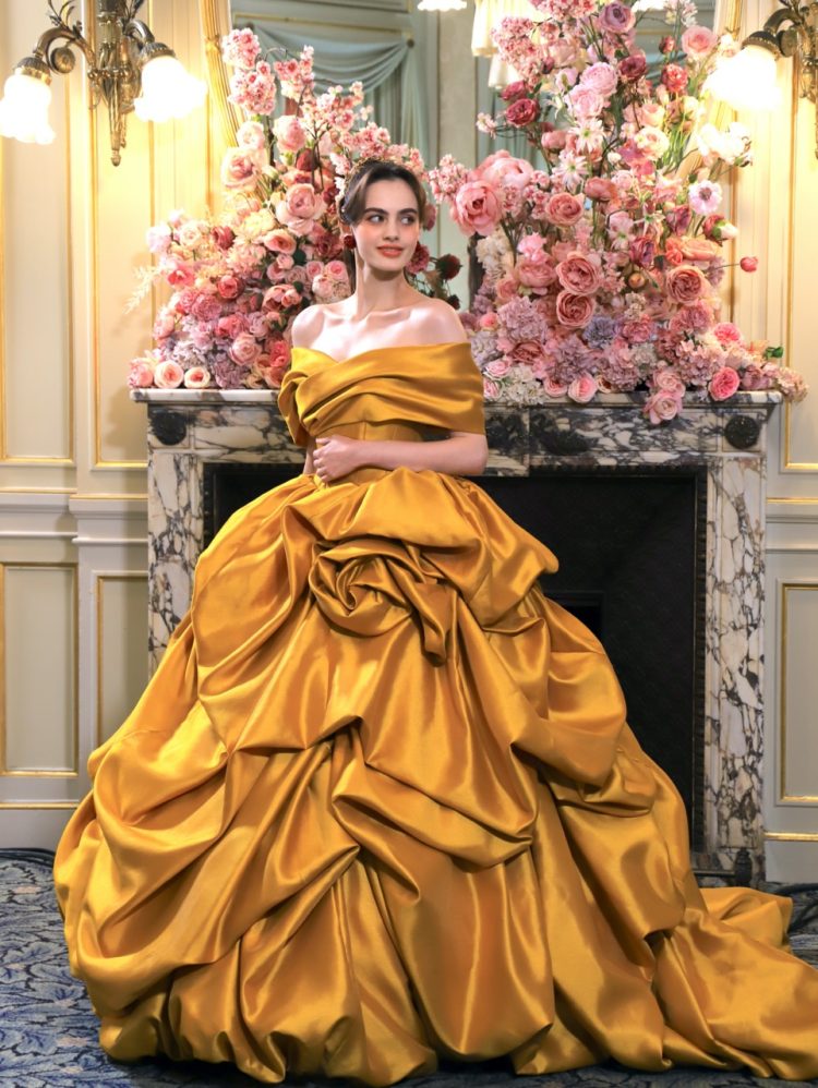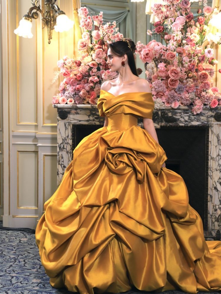 オフショルダーのデザインも、まさに物語のベルのドレスです。