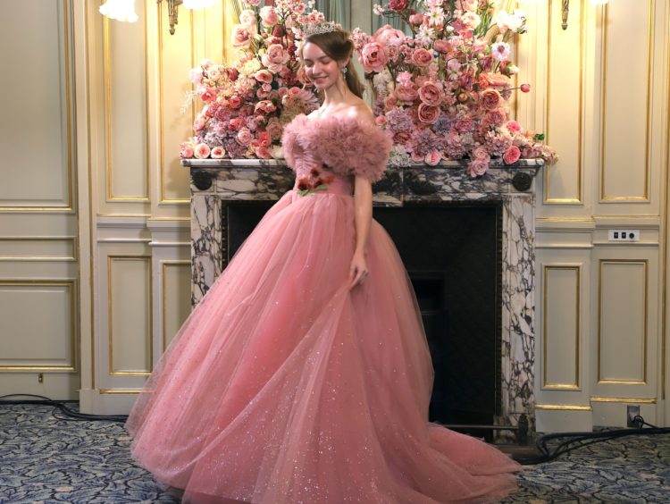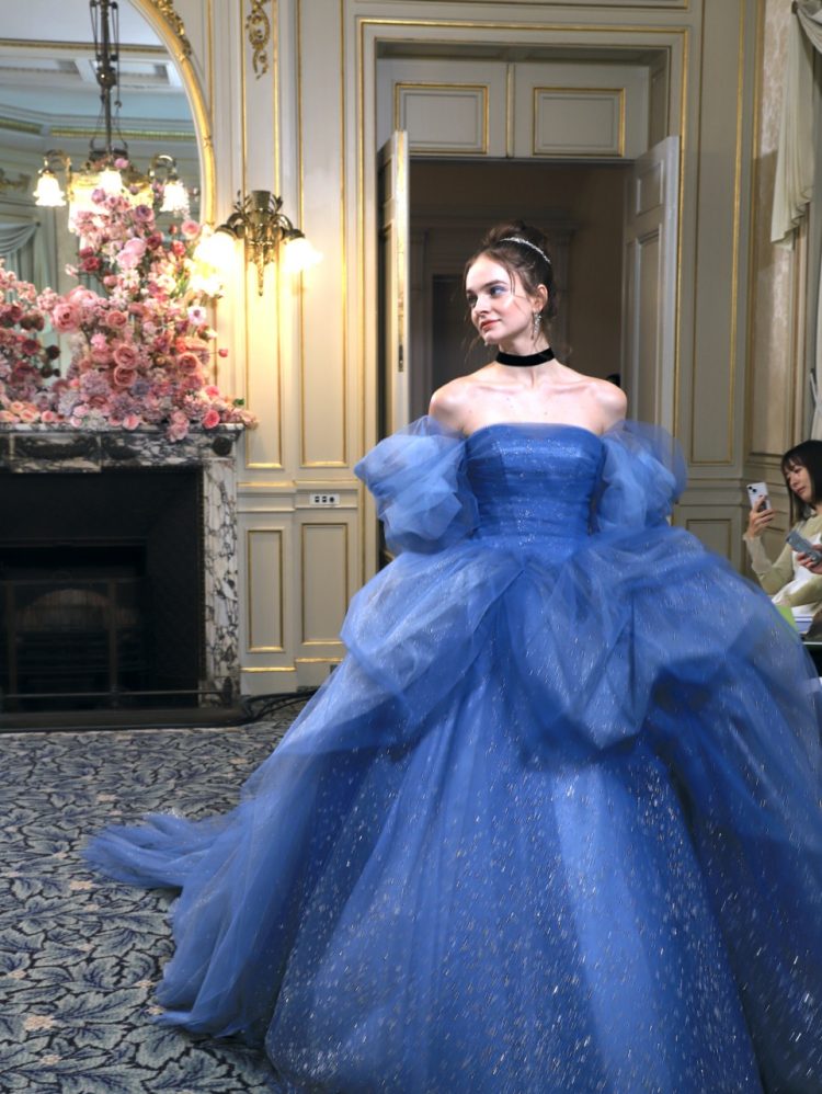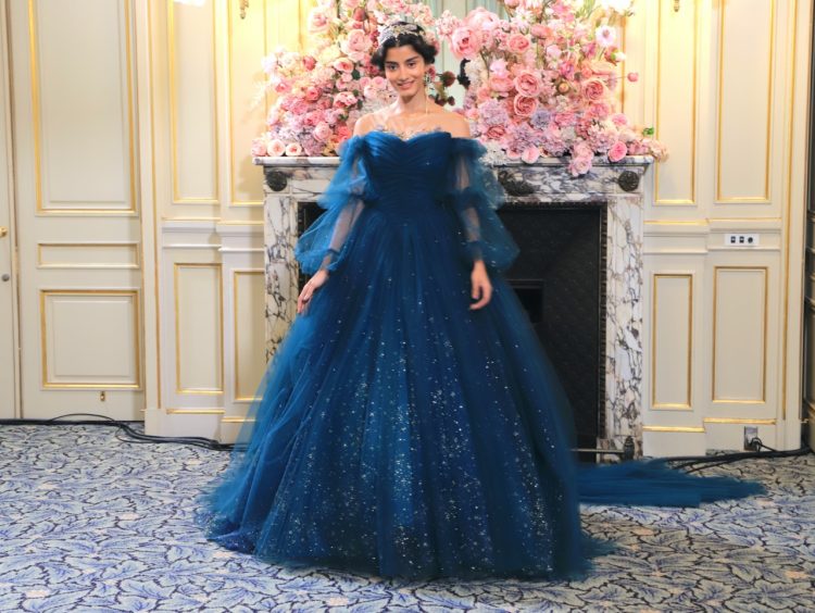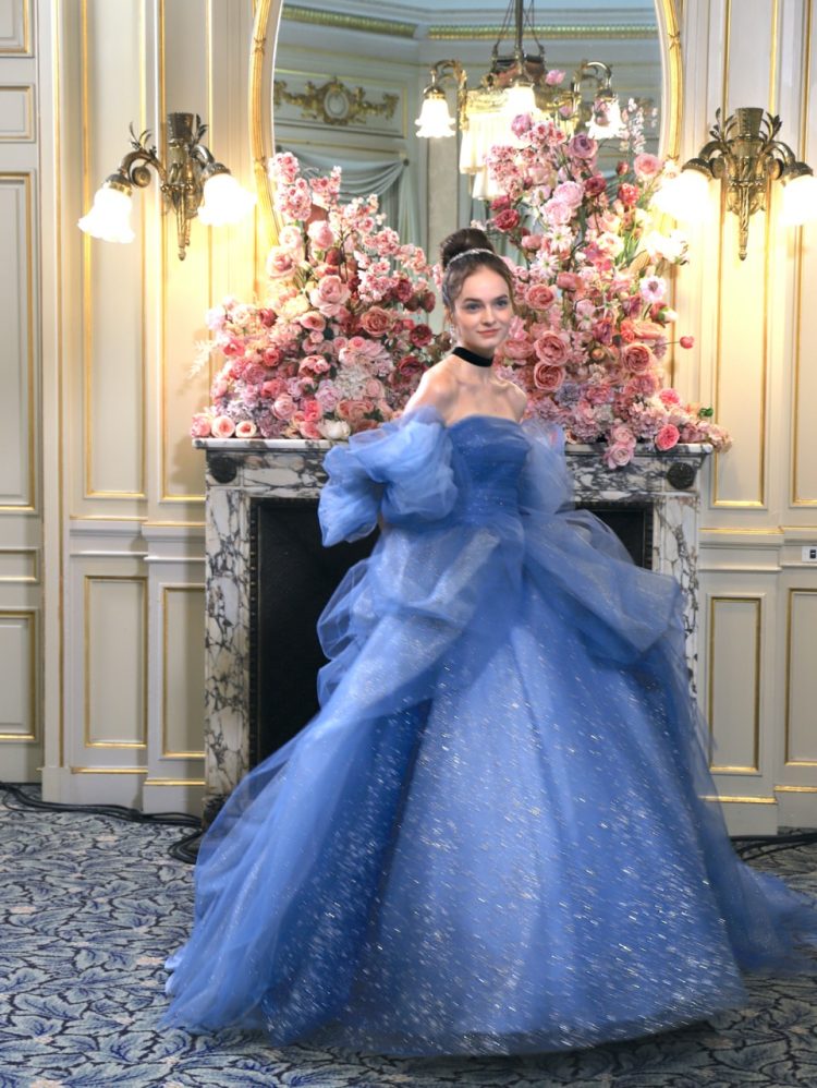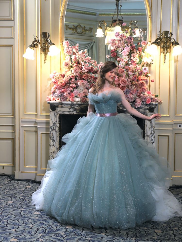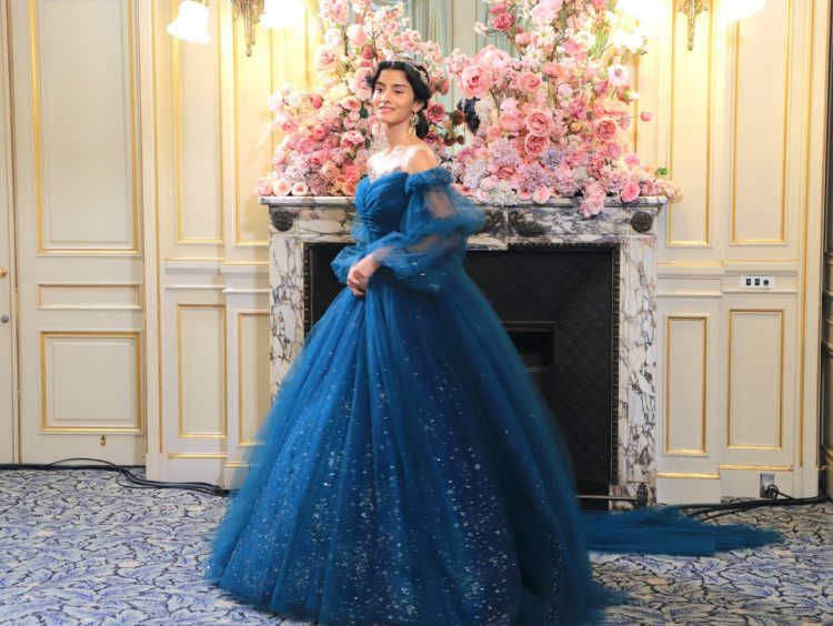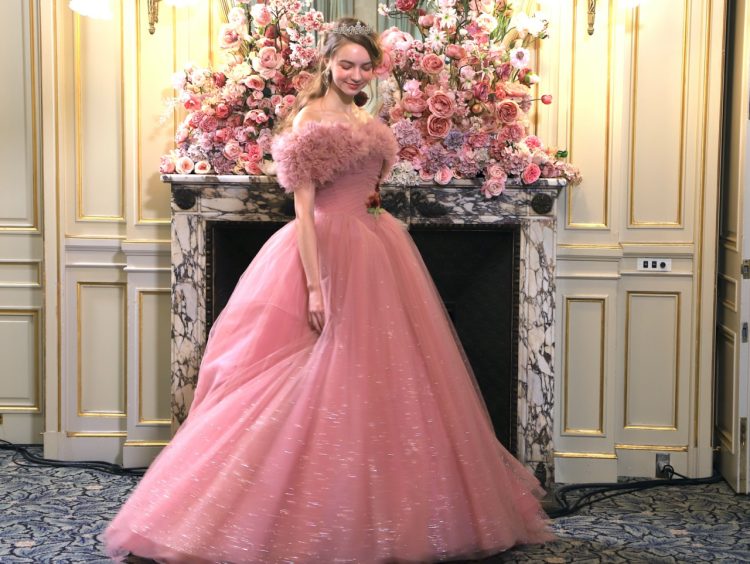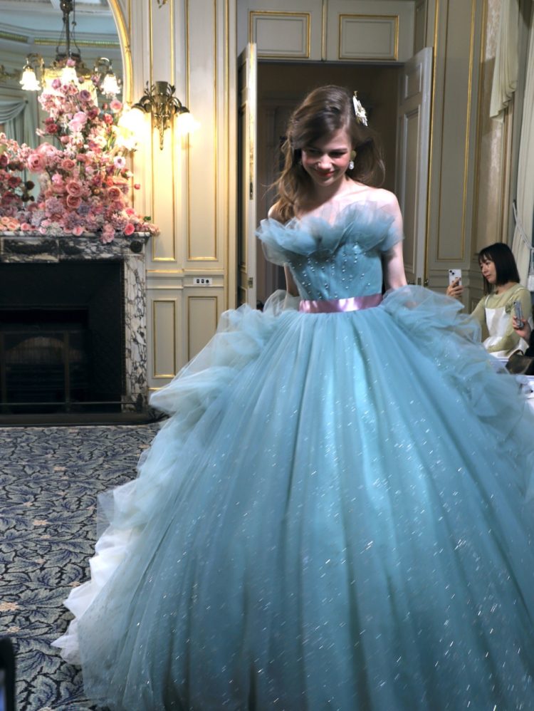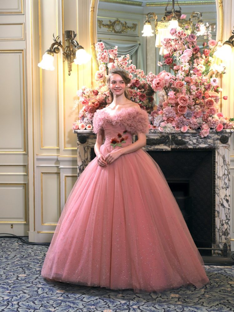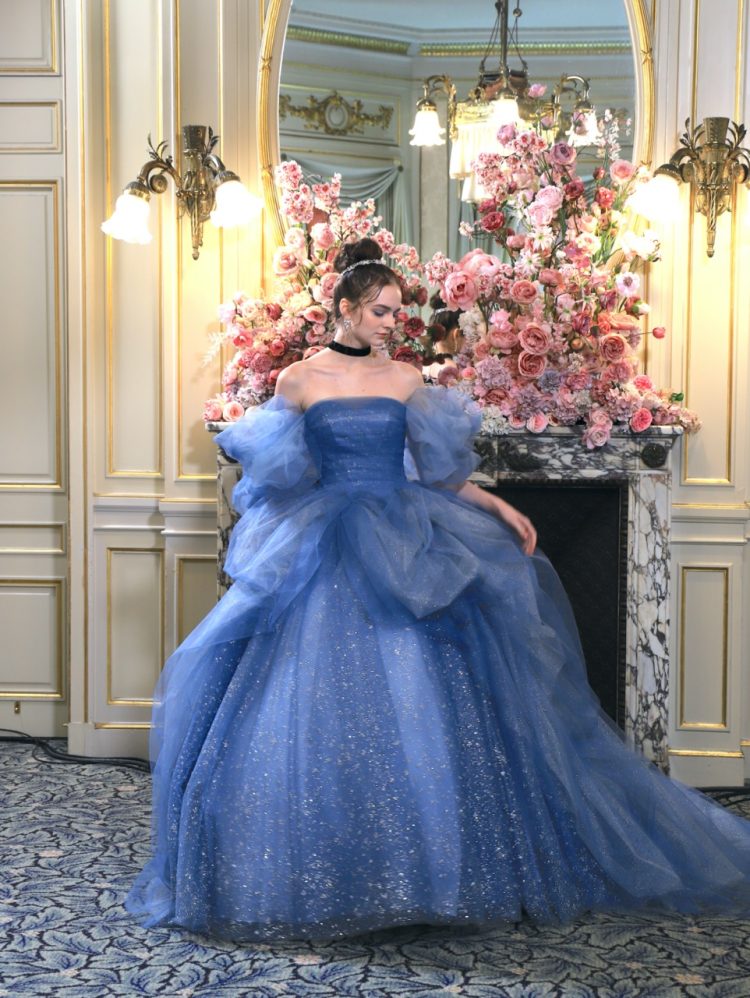 今回のコレクションでは、魔法使いがかける魔法のようなキラキラ素材とふんわりとしたチュール素材を組み合わせた1着に。