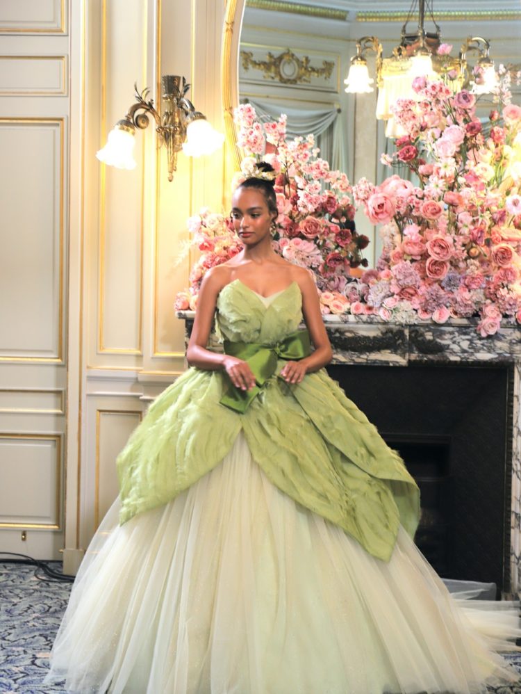 『プリンセスと魔法のキス』に登場するレストラン開業を夢見る女の子ティアナにインスパイアされたドレス。