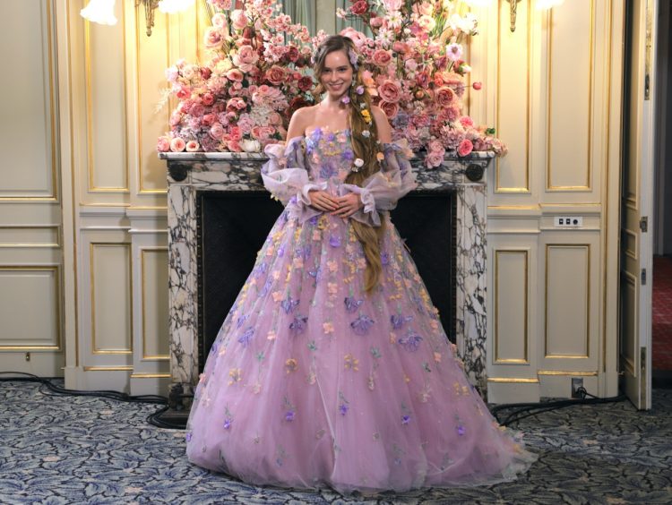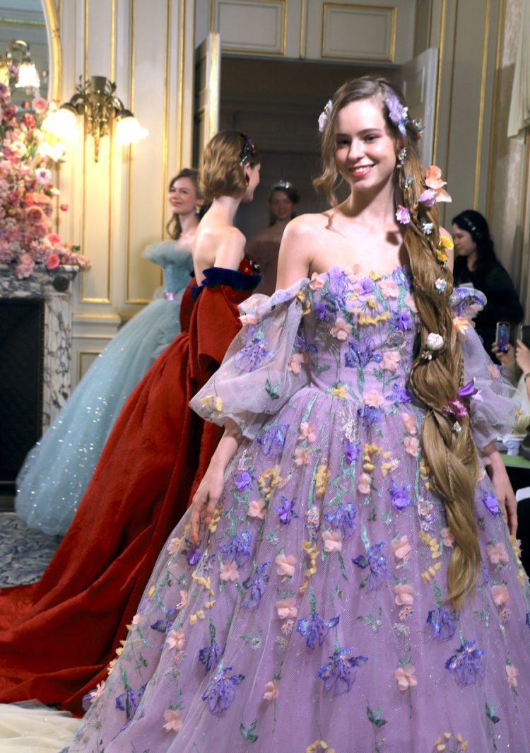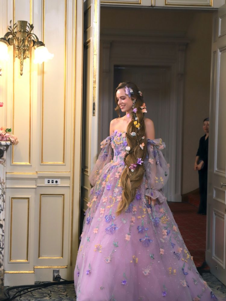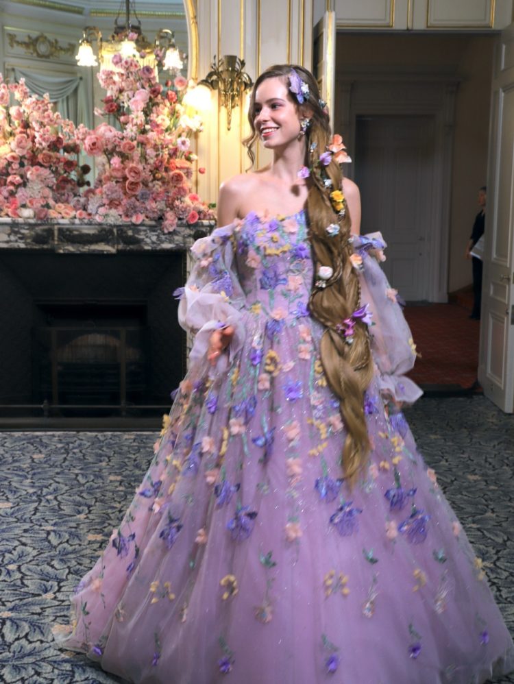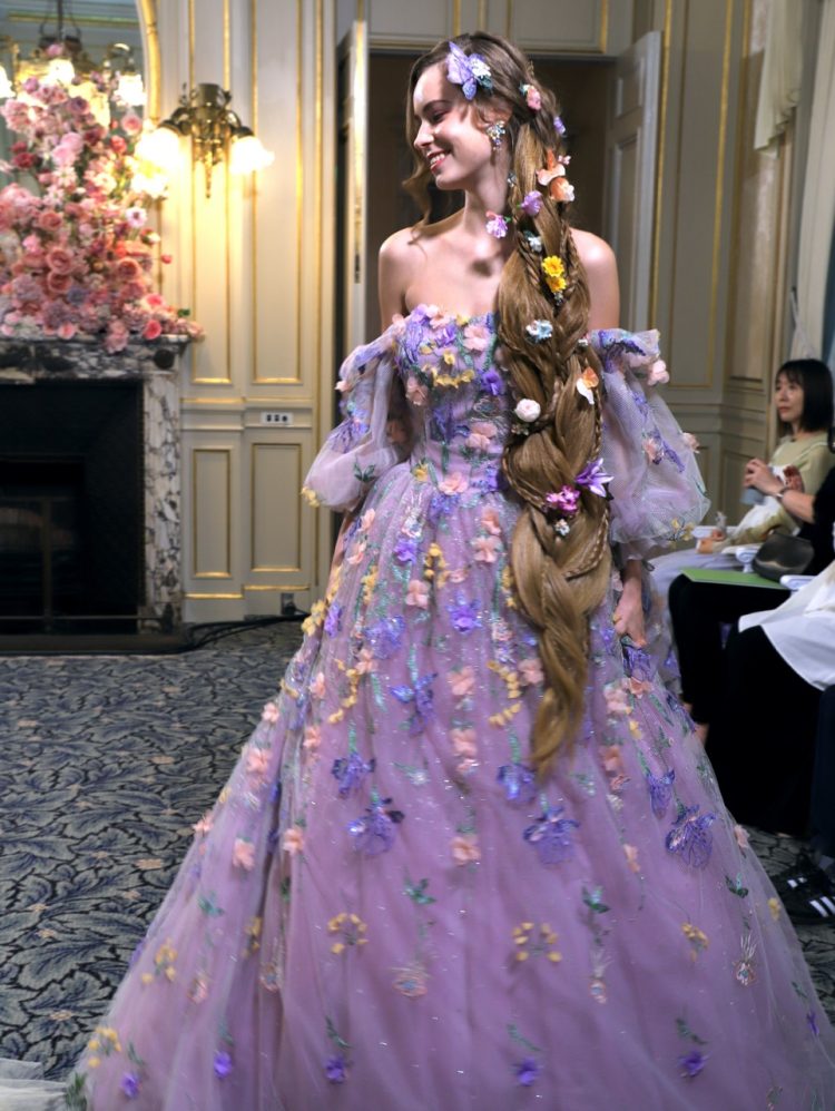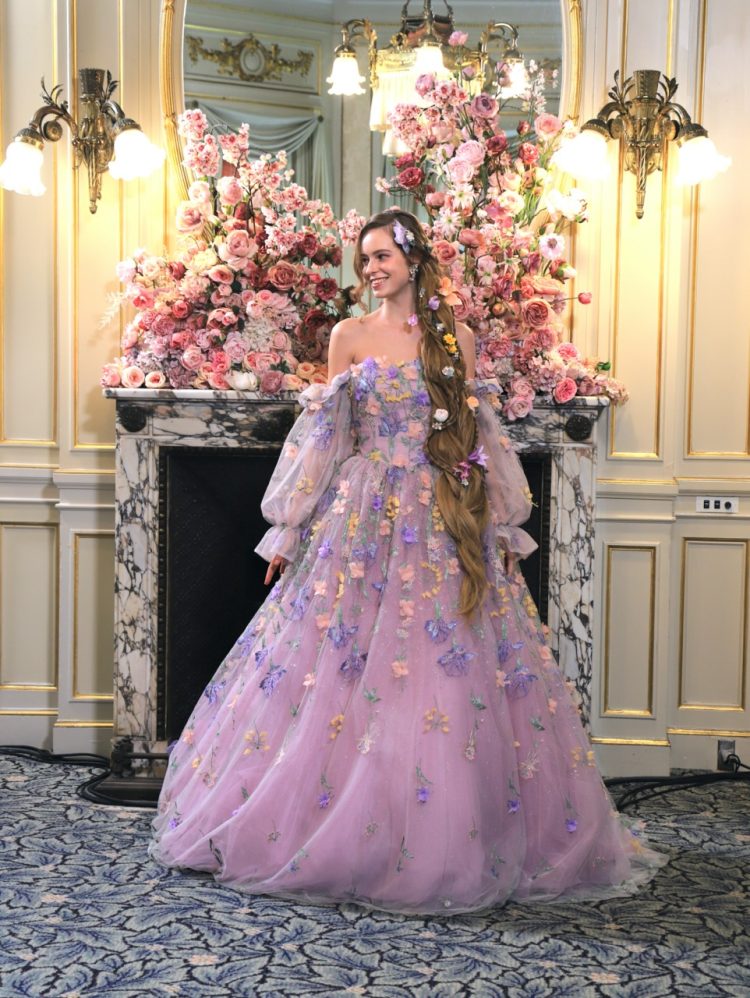 ラプンツェルにインスパイアされたカラードレスは、立体的なお花と刺繍を組み合わせた1着に。