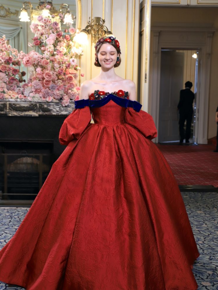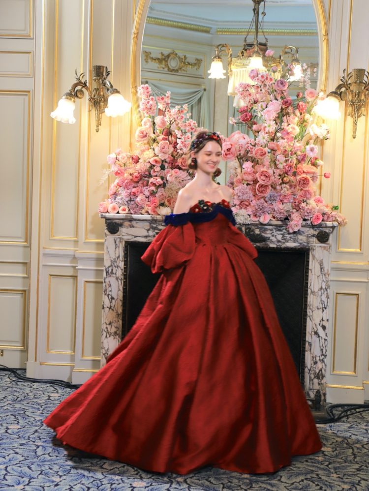 ジャガード織の生地や胸元のベロア素材、お花のデザインで高級感あふれるドレスに仕上がっています。