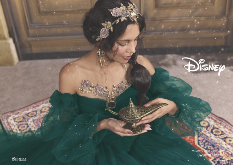 ブルーグリーンのチュールに、オリエンタルなゴールドのグリッターが煌めく、「ジャスミン」にインスパイアされたドレス。