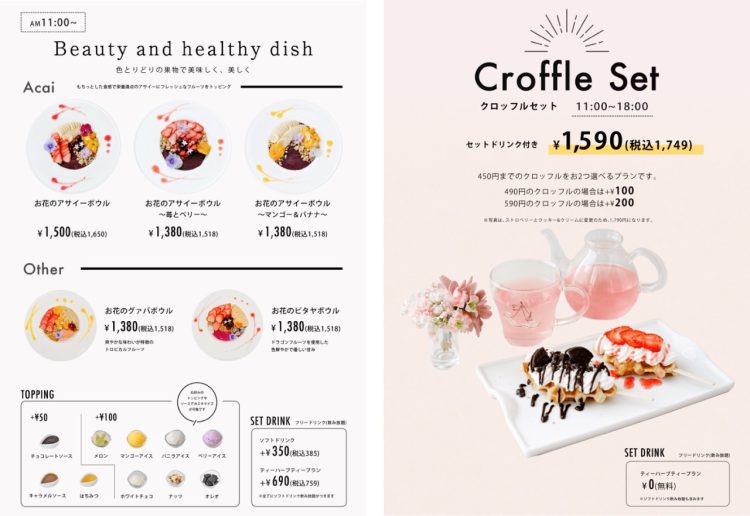お花とフルーツで彩られたアサイーで内から美しく健康に。豊富なトッピングからお好みのカスタマイズが可能です。